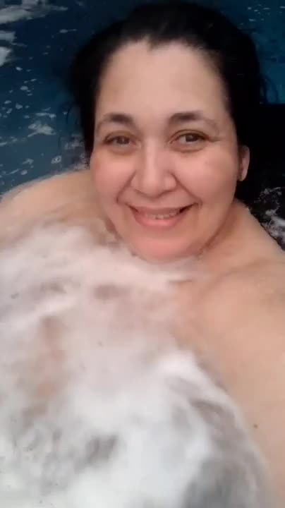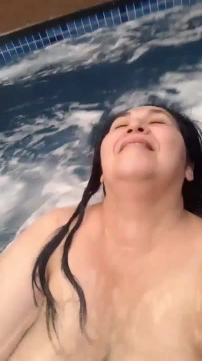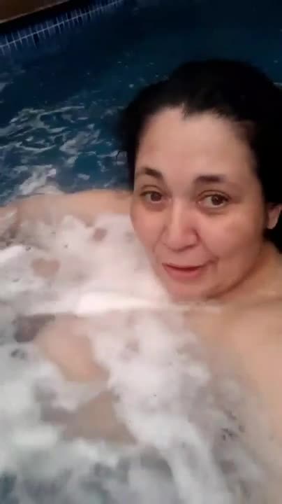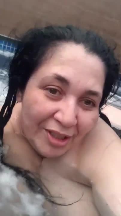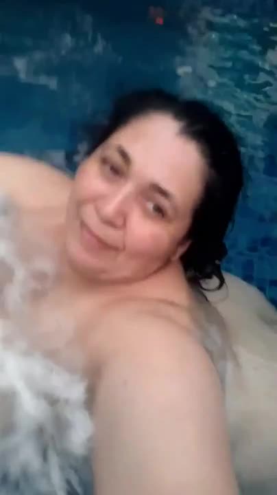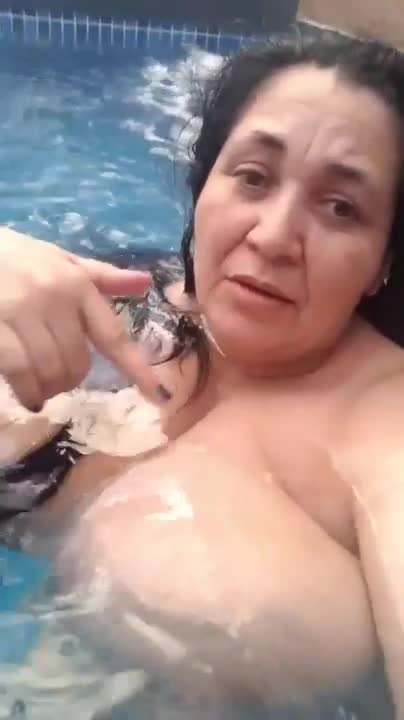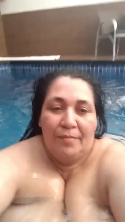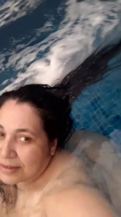 Зрелая толстуха купается обнаженной в бассейне