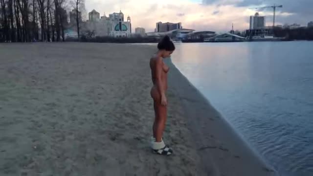 Парочка приехала на берег реки.Телка не стесняясь рыбаков поблизости, разделась догола и окунулась в ледяную воду