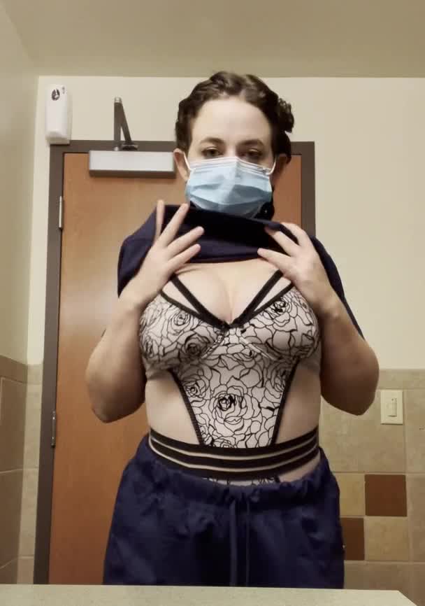 Красивая женщина в туалетной комнате во время работы показывает сиськи и шикарное нижнее бельё.
