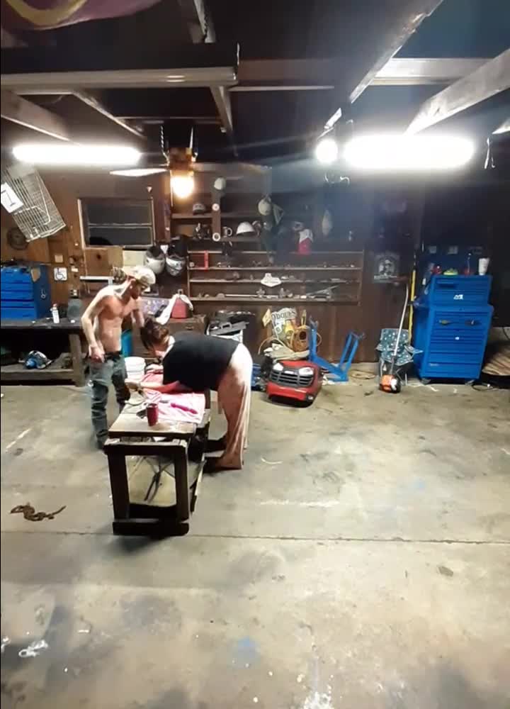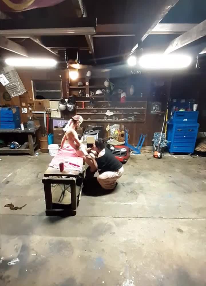 чувак кладет телефон в потайное место и снимает на видео, как его толстая дама делает ему минет, а затем трахает ее в гараже, где он работает.