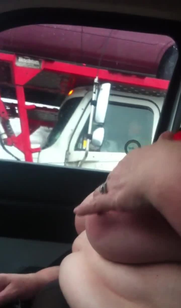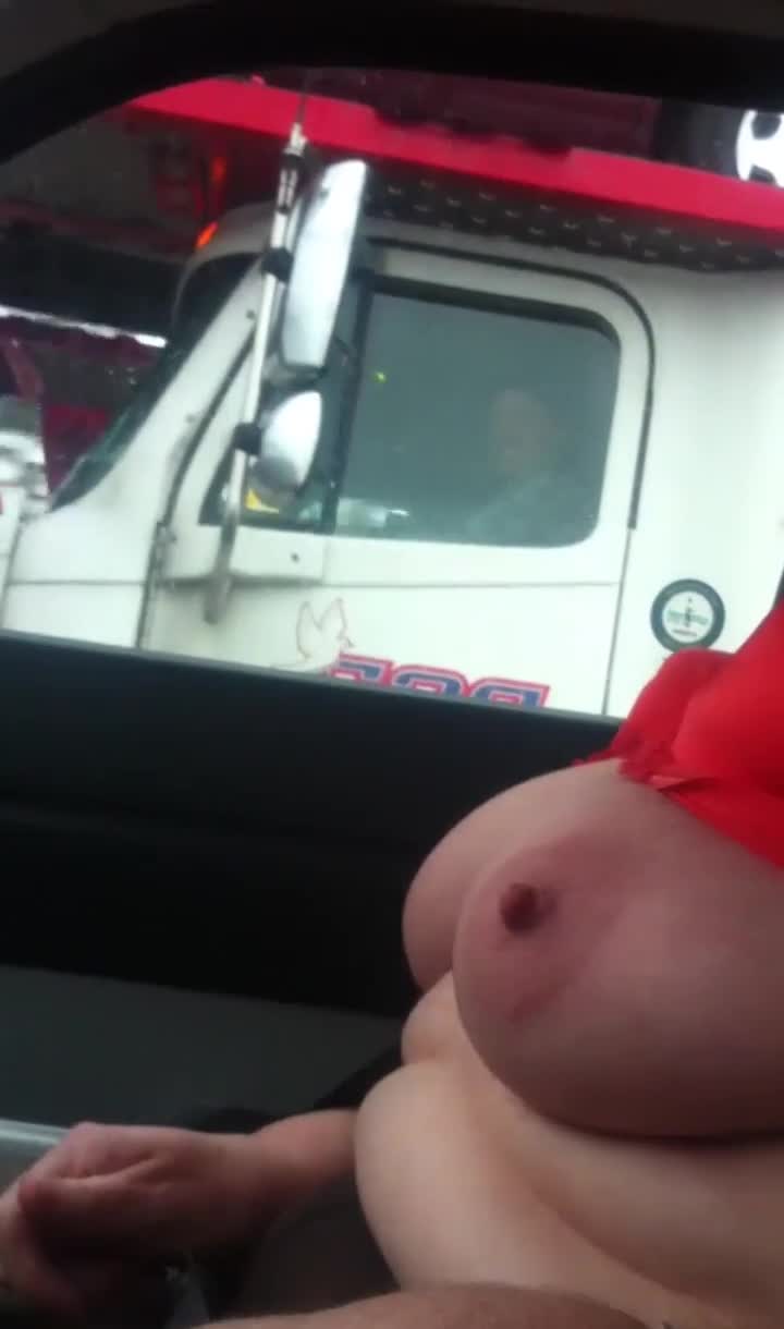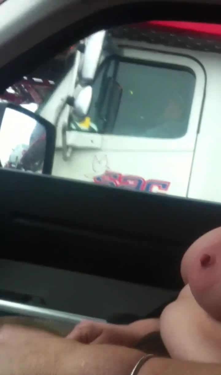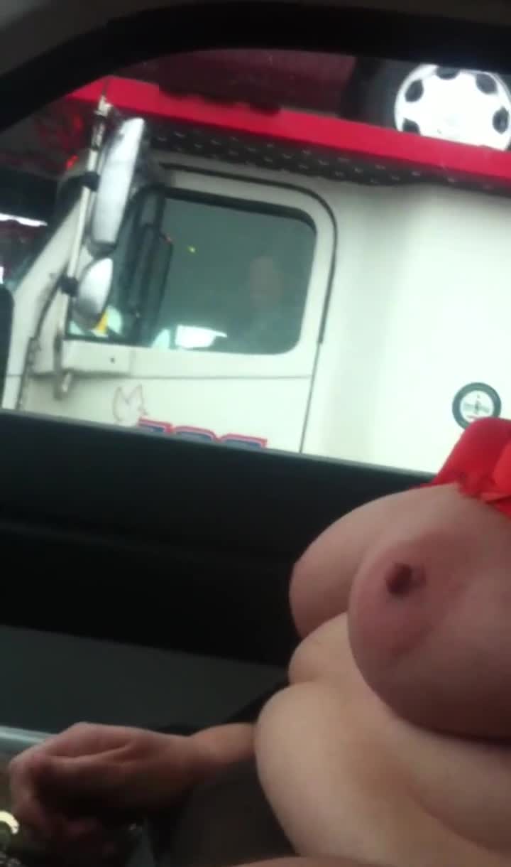 жена показывает свои сиськи водителю грузовика, а ее муж снимает во время вождения.