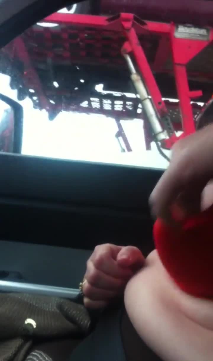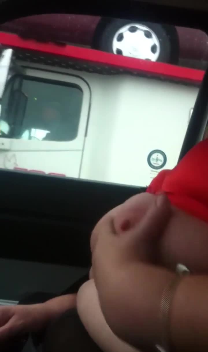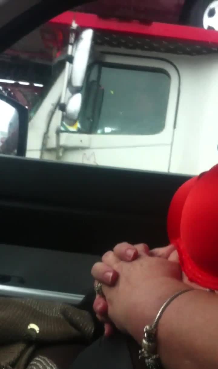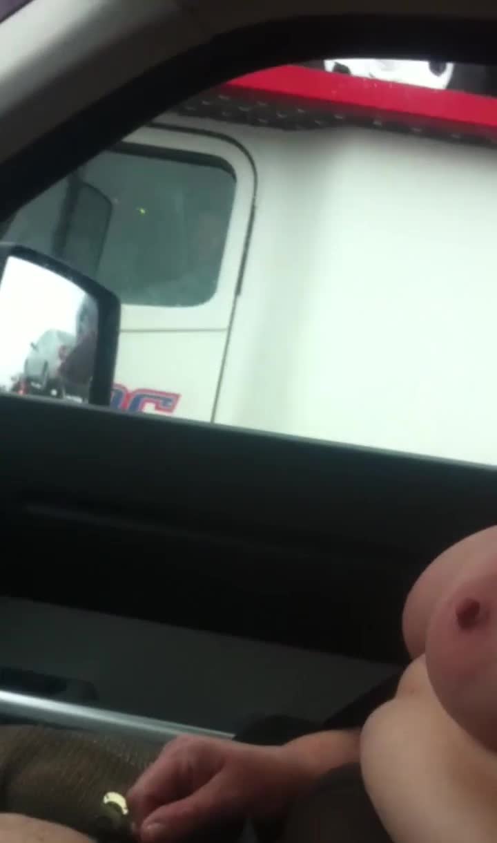 жена показывает свои сиськи водителю грузовика, а ее муж снимает во время вождения.