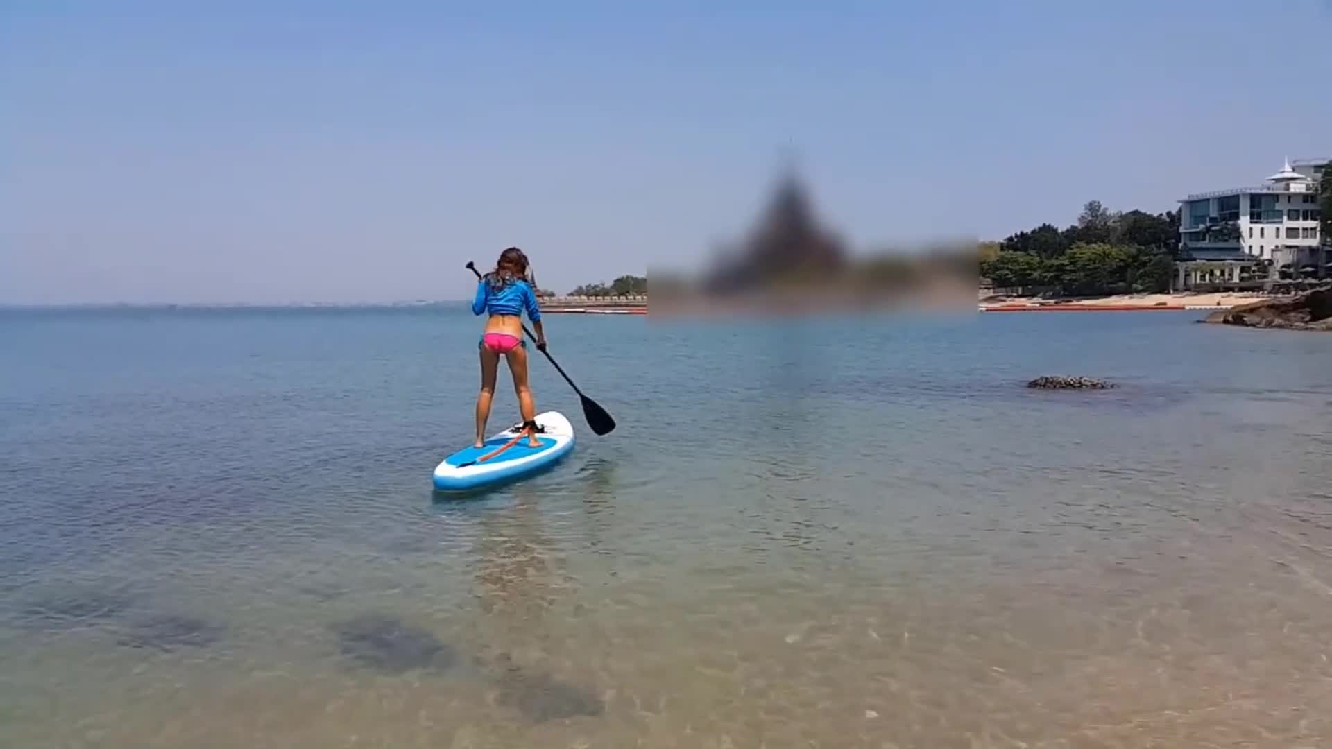Девушка плавает на сапе с анальной пробкой