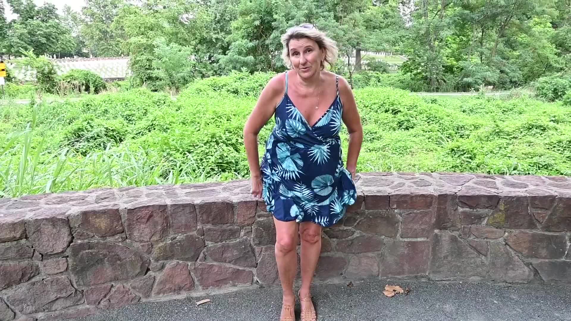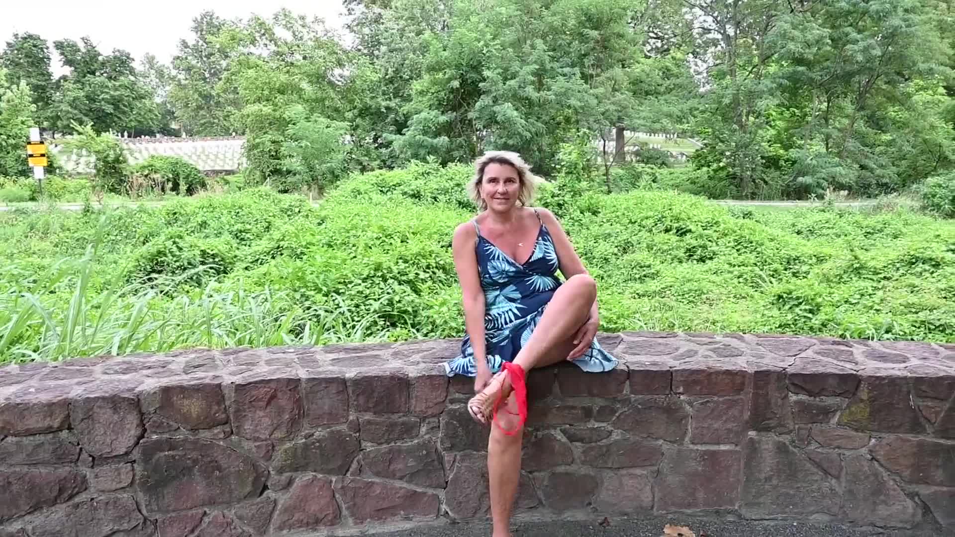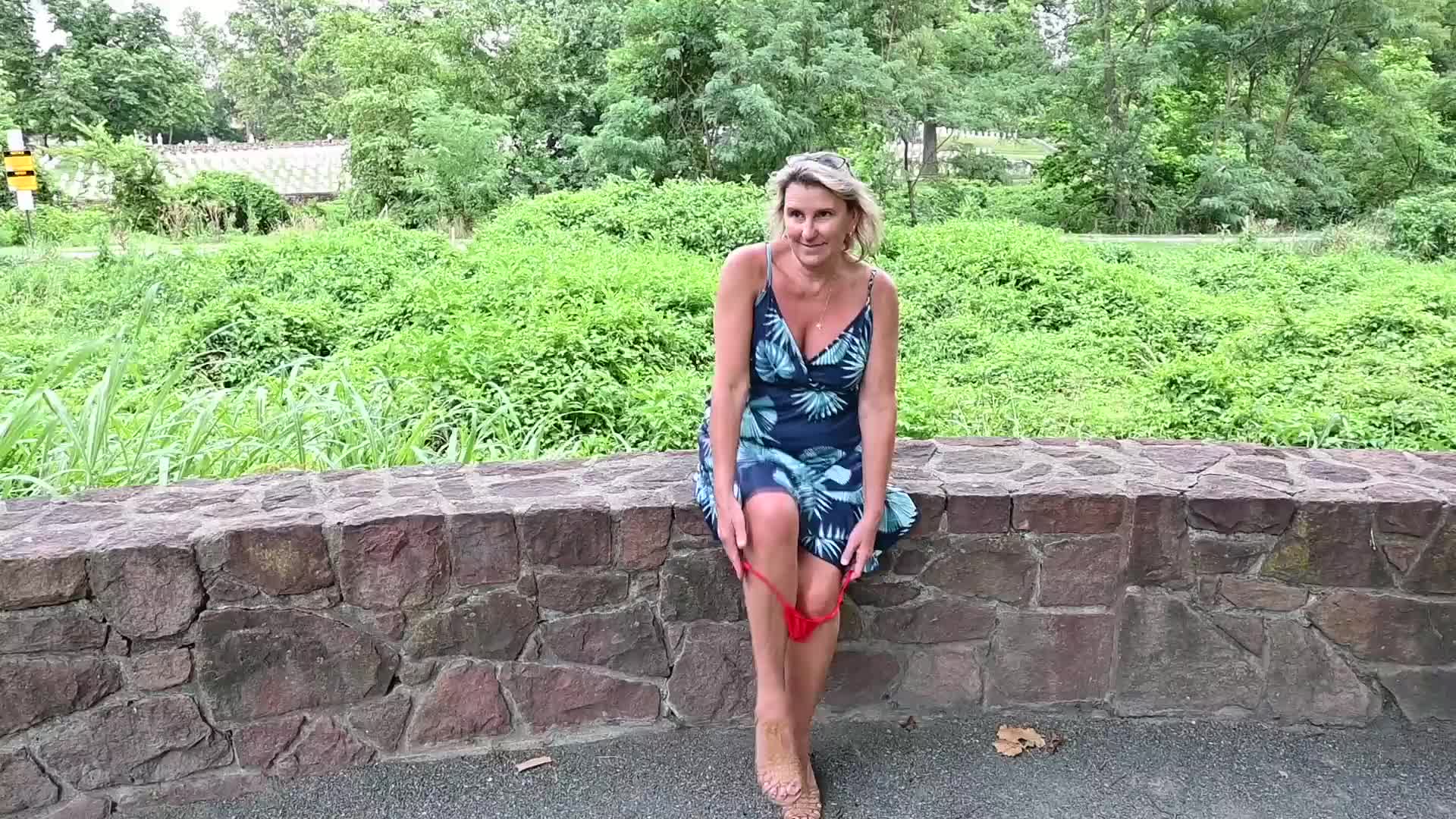 Зрелая блондинка сняла трусики на прогулке и продемонстрировала свою интересную киску