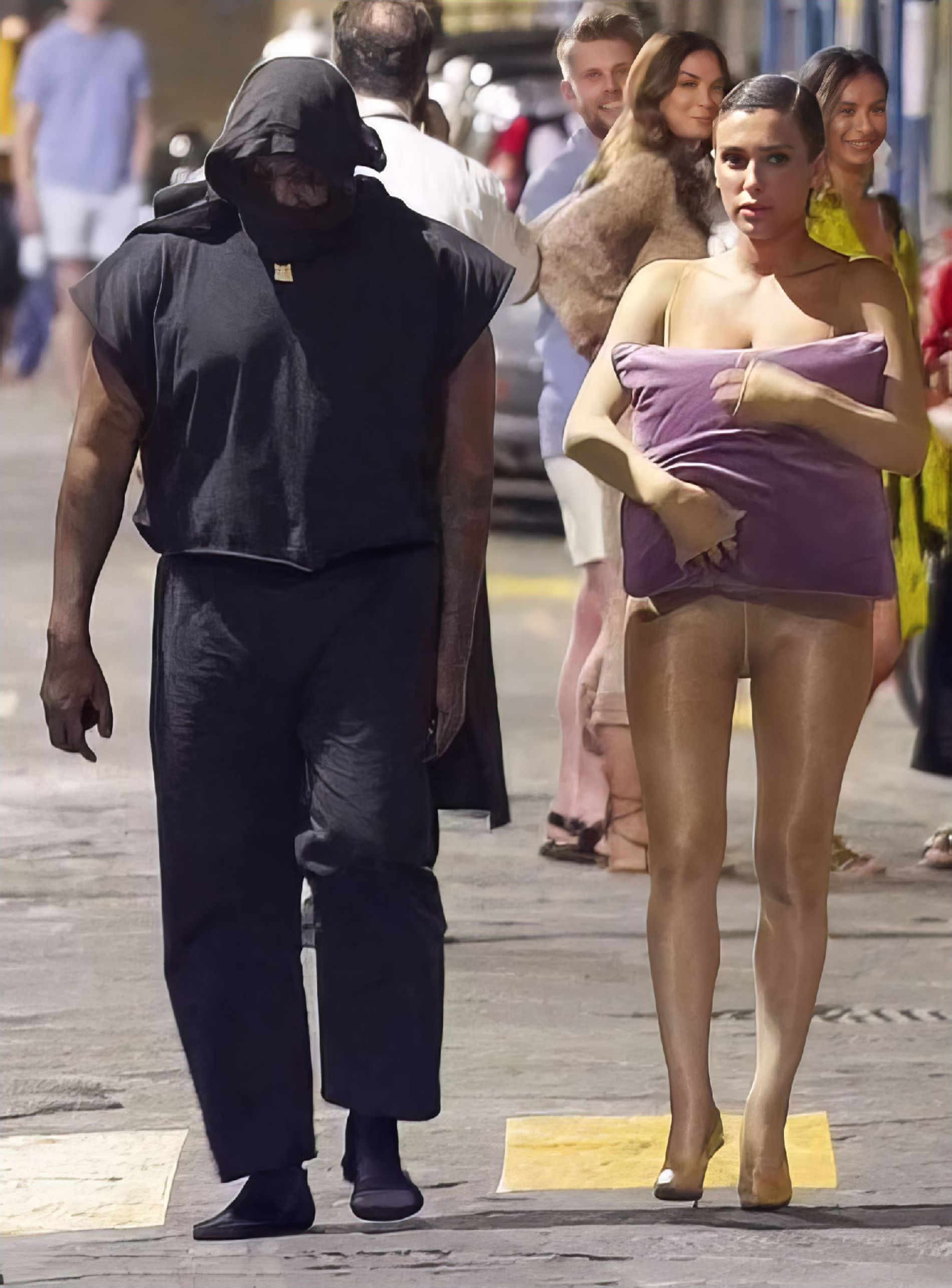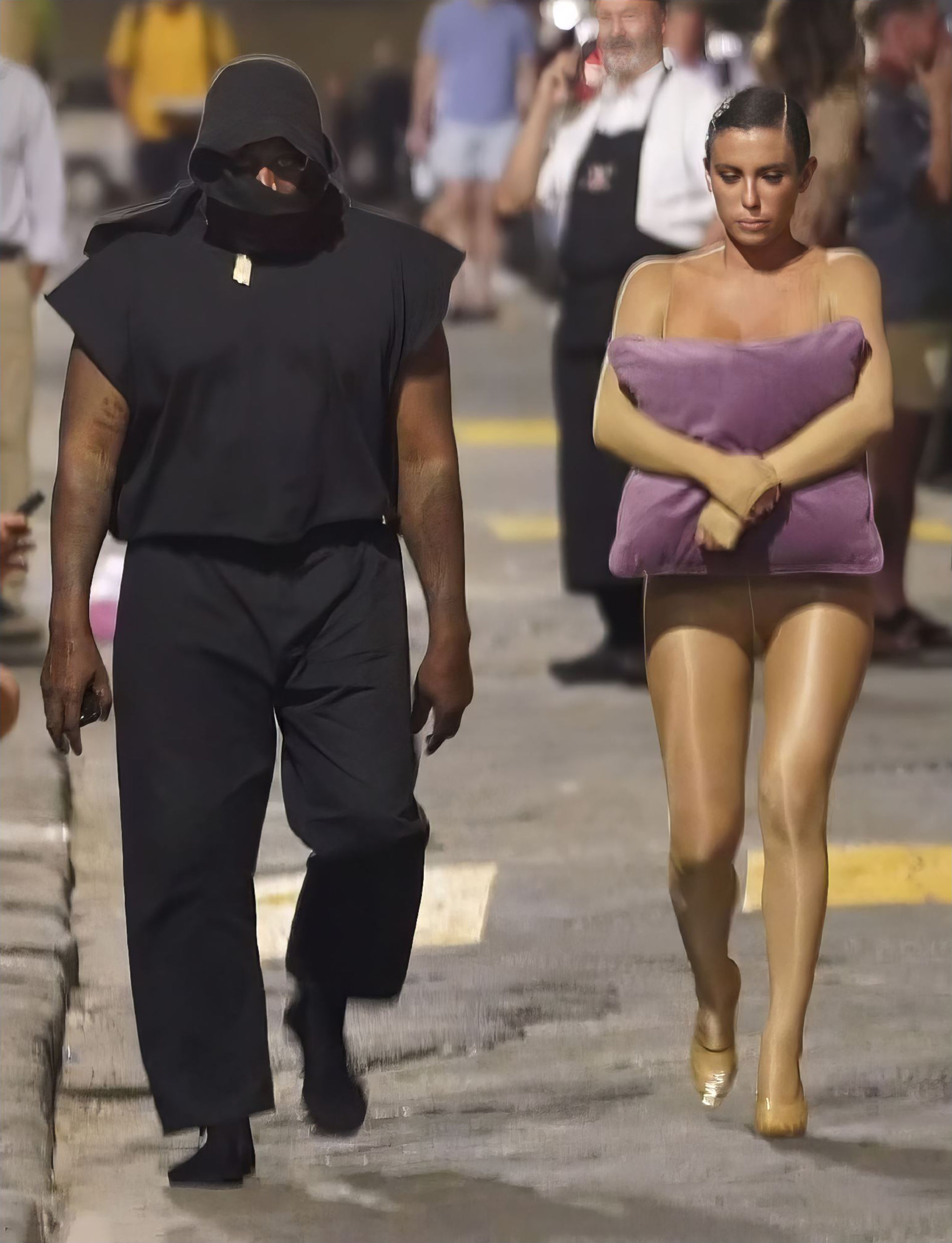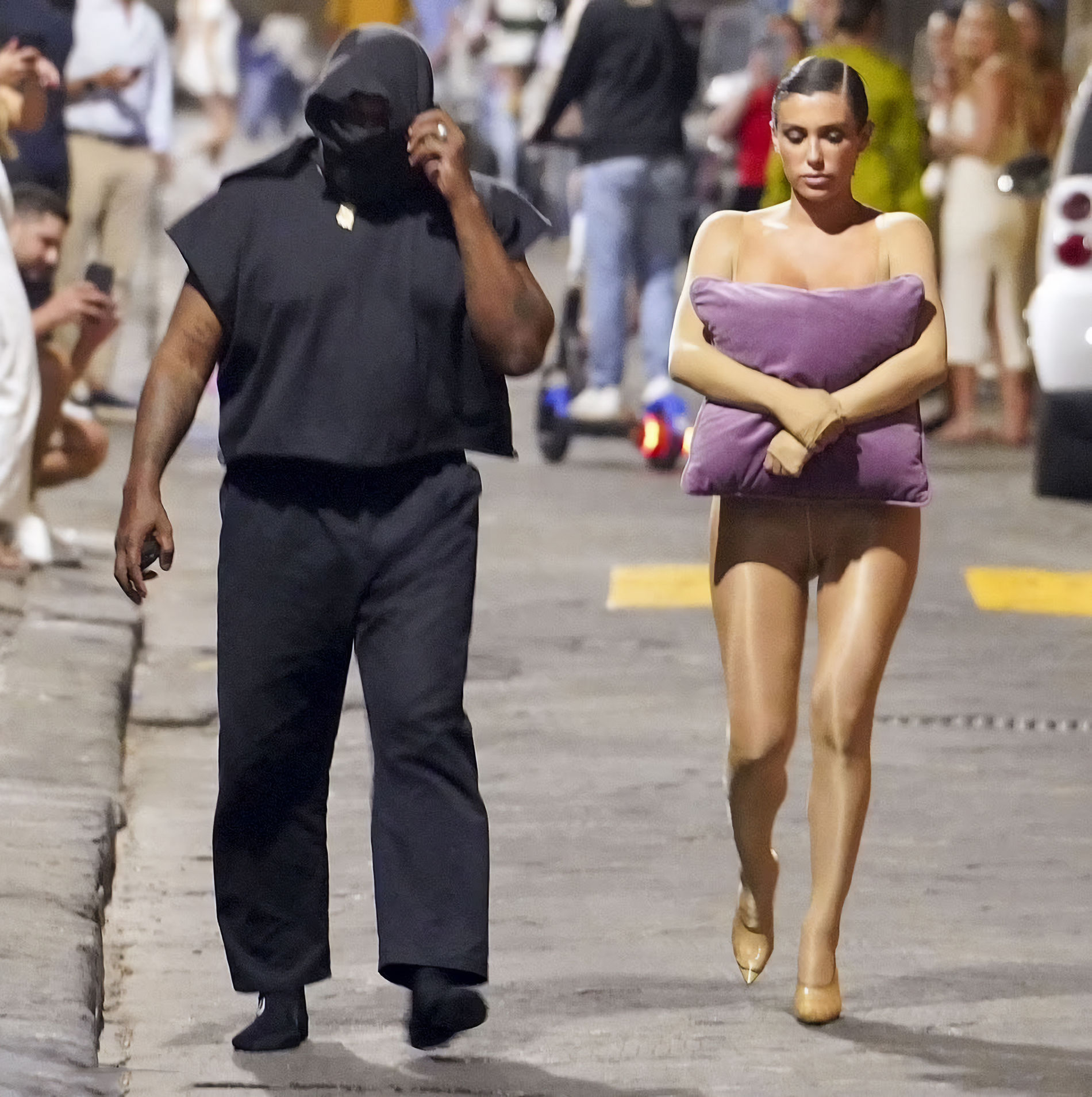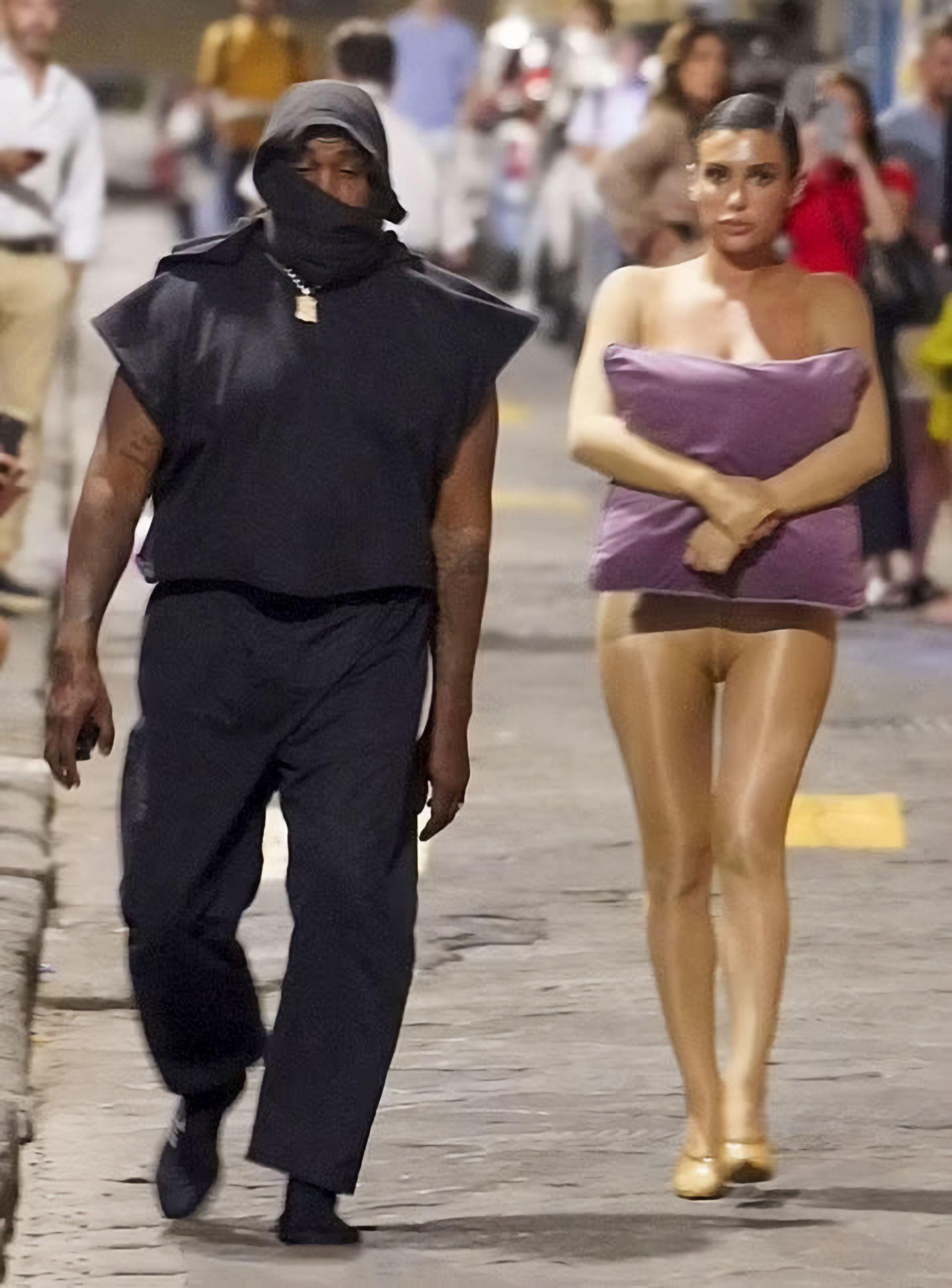 Бьянку заметили в одних колгоках и с подушкой, когда она и ее муж рэпер Канье Уэст выходили из своей гостиницы во Флоренции 6 сентября 2023 года. Она носила этот наряд в течение всего дня и также делала покупки в городе в том же образе. Может быть, ей все равно. Но ее лицо рассказывает другую историю. Но кто знает. Канье любит внимание.