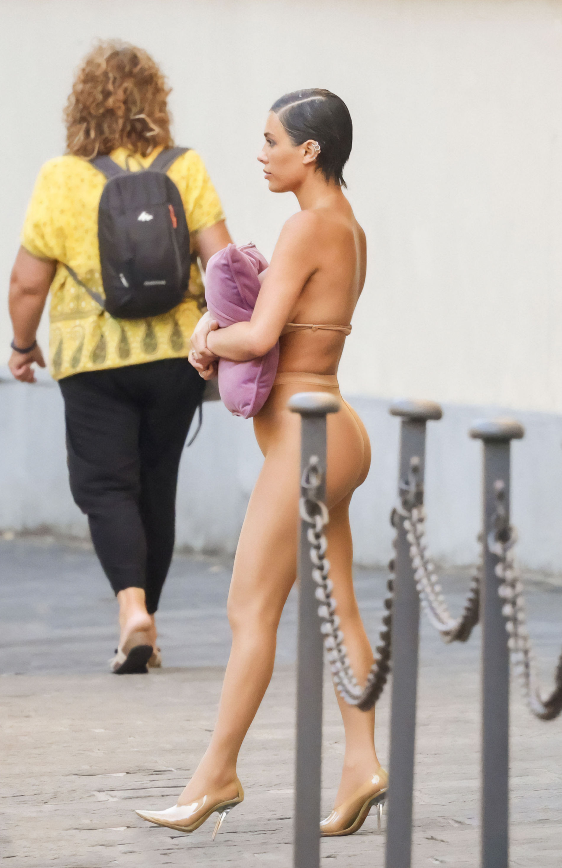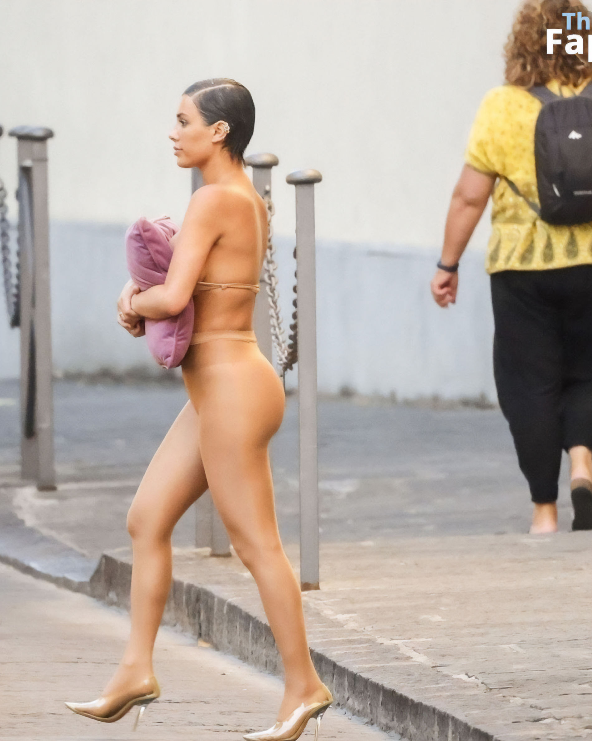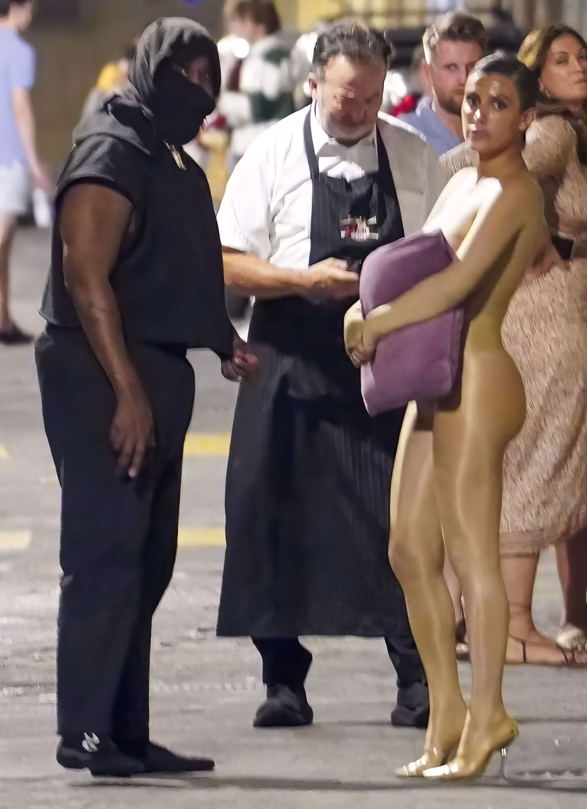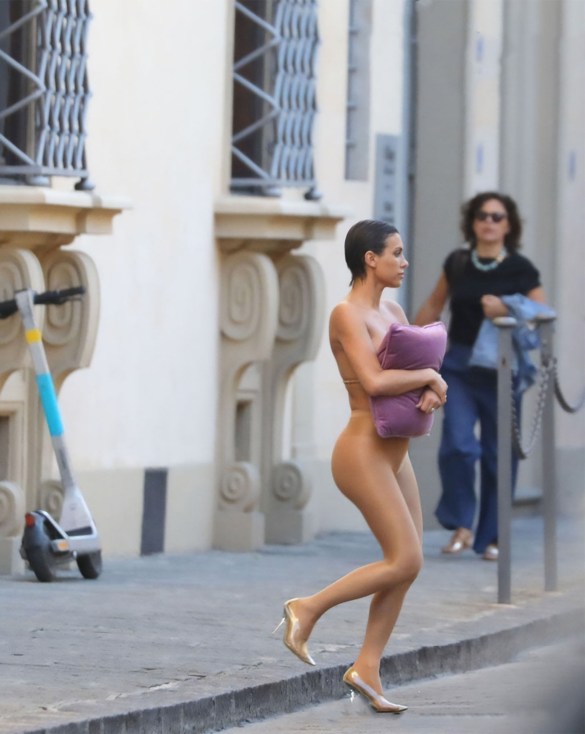 Бьянку заметили в одних колгоках и с подушкой, когда она и ее муж рэпер Канье Уэст выходили из своей гостиницы во Флоренции 6 сентября 2023 года. Она носила этот наряд в течение всего дня и также делала покупки в городе в том же образе. Может быть, ей все равно. Но ее лицо рассказывает другую историю. Но кто знает. Канье любит внимание.