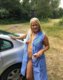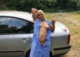 Женщина на природе показывает стриптиз возле машины с сигаретой