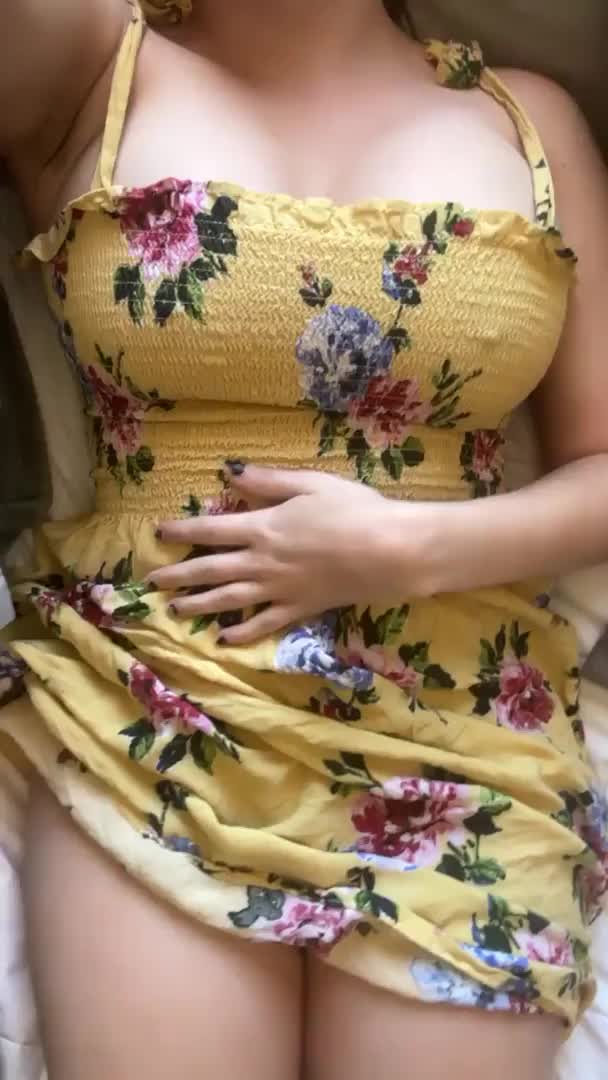 Женщина в ярком жёлтом платье показывает привлекательные и упругие сиськи.