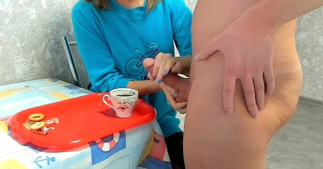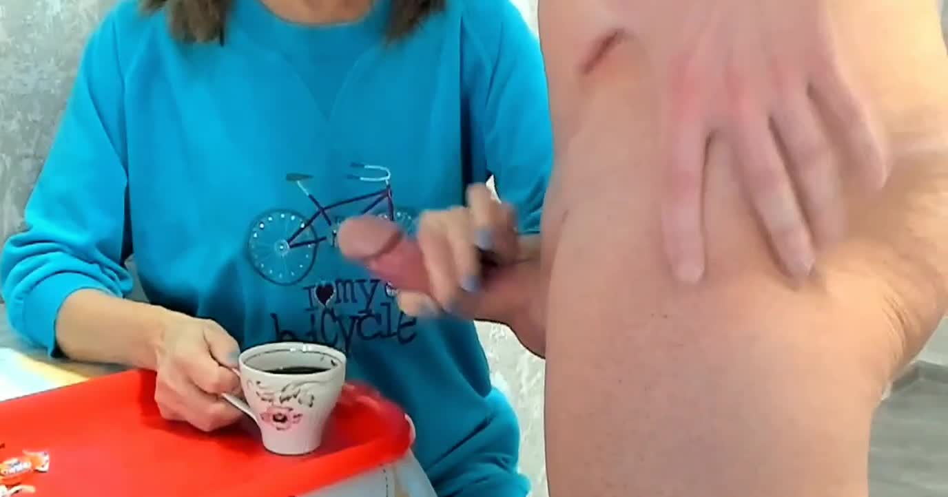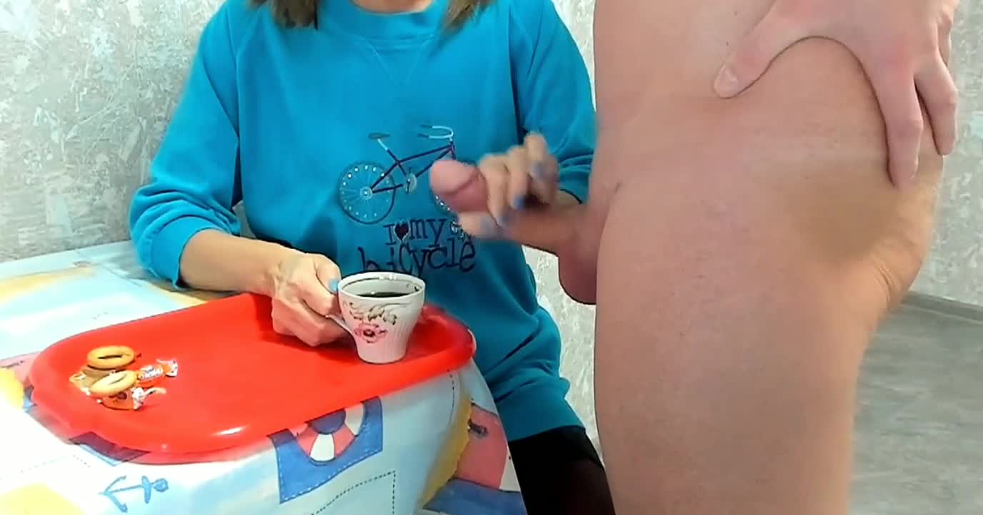 Танюшка пьет кофе, но сливок нет!! Подозвала своего молодого жеребца и надрочила с него сливок в кофе!