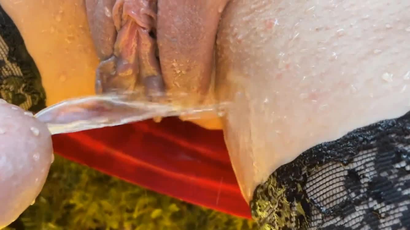 Забралась на пенёк поссать? Ну не в траву же приседать. К тому же так боле сподручно, Самой обоссаной быть влучно.