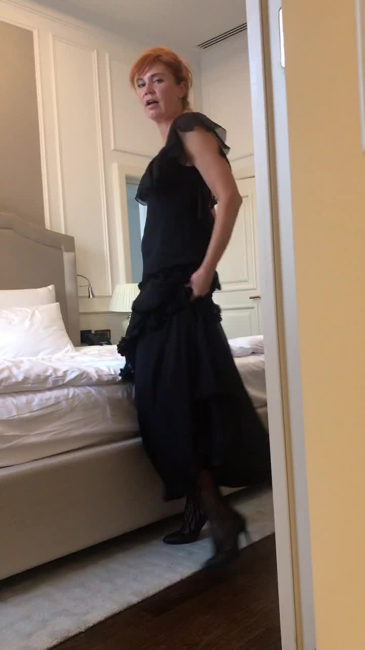 Развратная дама в чёрном вечернем платье мастурбирует