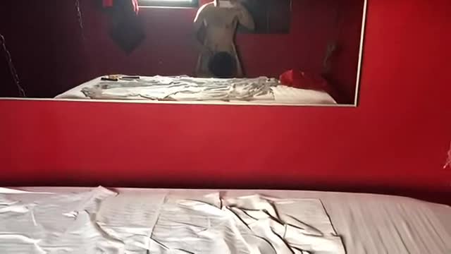 Чувак снимает сперва через отражение в зеркале, как проститутка сосет, потом как трахает ее раком
