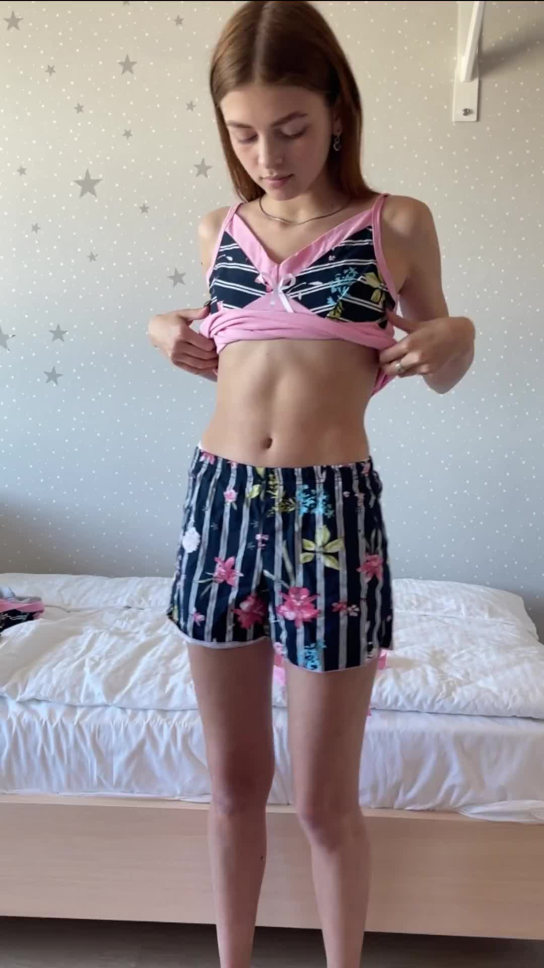 девушка снимает пижаму остается в белых прозрачных трусиках