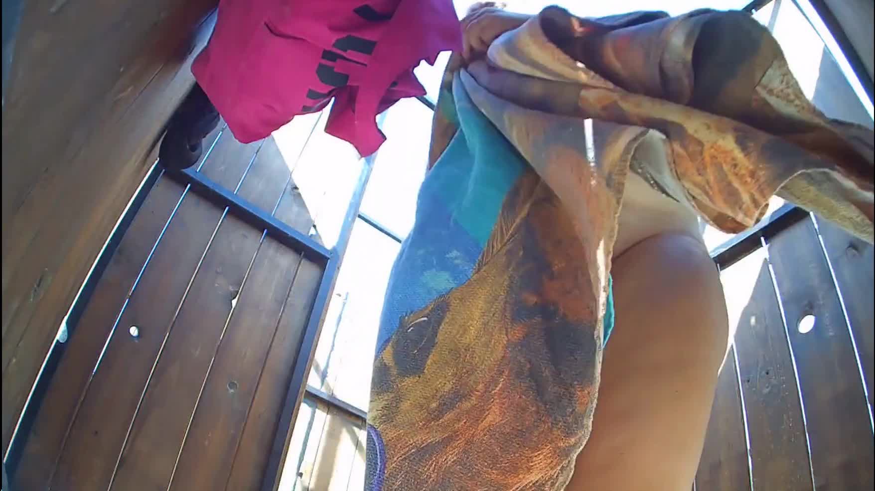 Кто то установил камеру в пляжной кабинке и застал пышнотелую женщину за переодеванием.