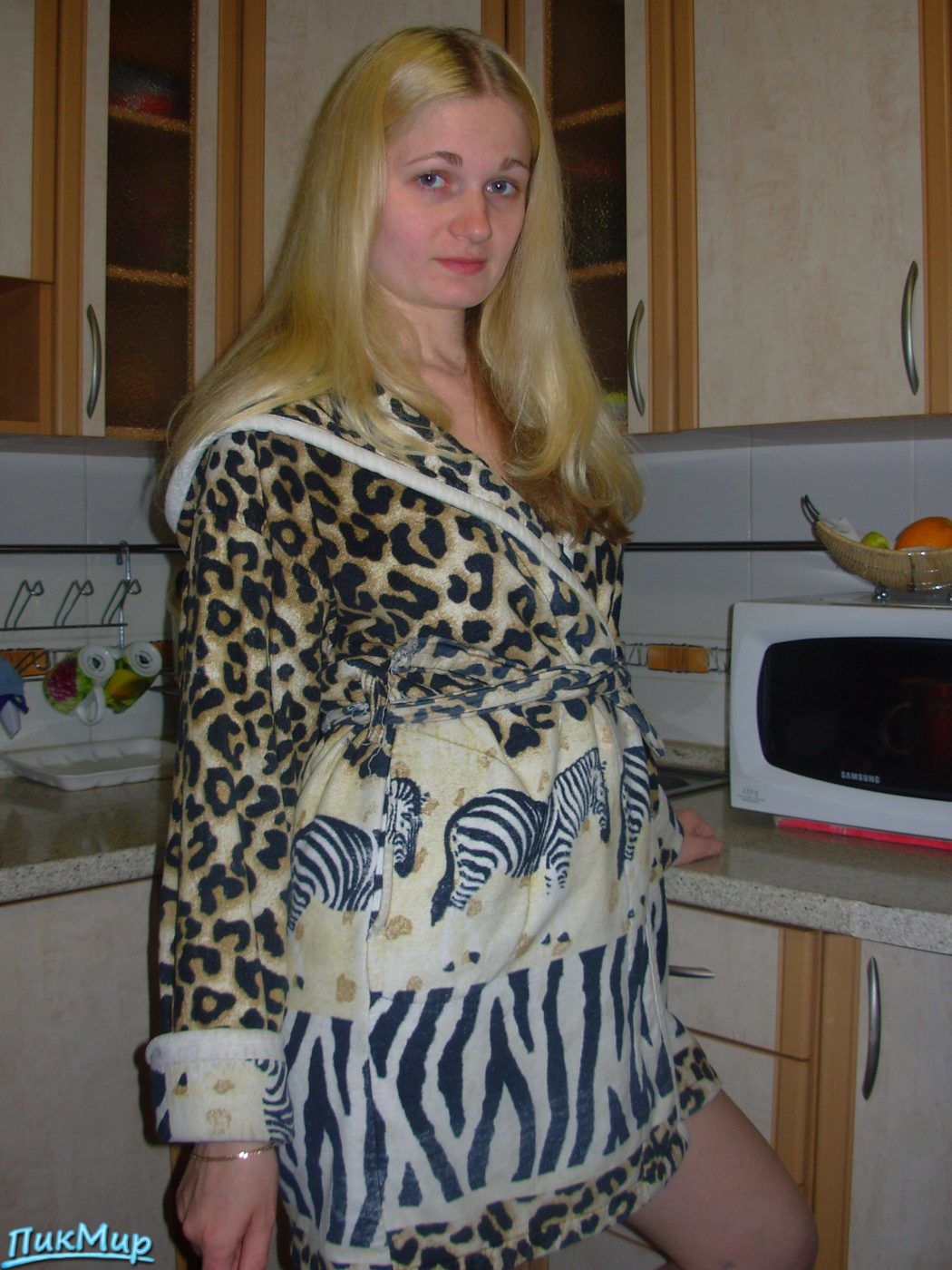 Со сброшенным халатиком. Она моложе выглядит. И грудка такая приятная налетая.