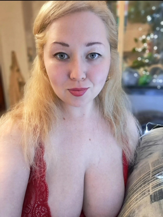 Полная блондинка с красивой грудью и богатым воображением.