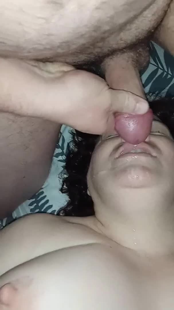 Мужчина трахает в рот зрелую толстую темноволосую женщину и кончает ей в рот!