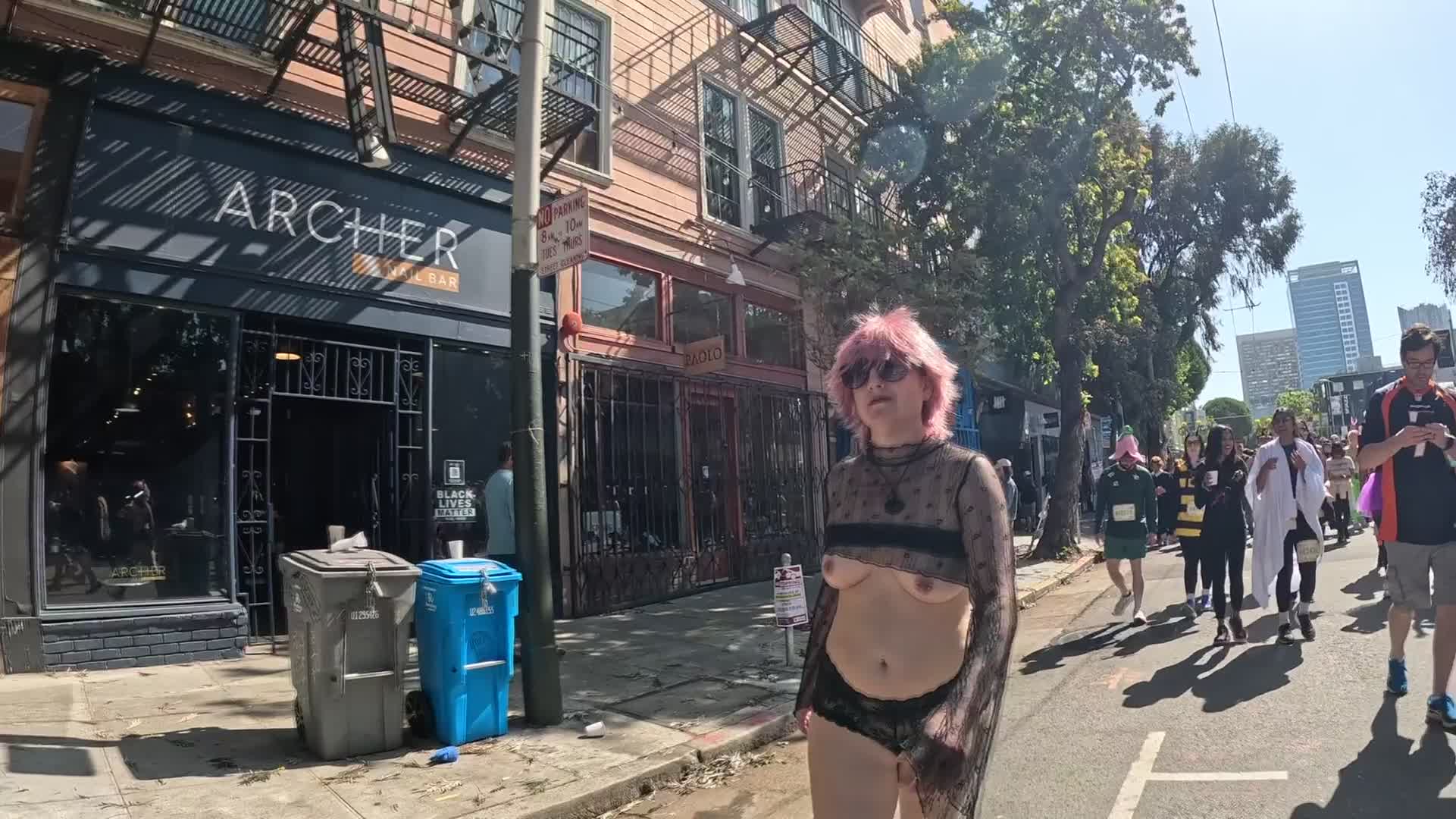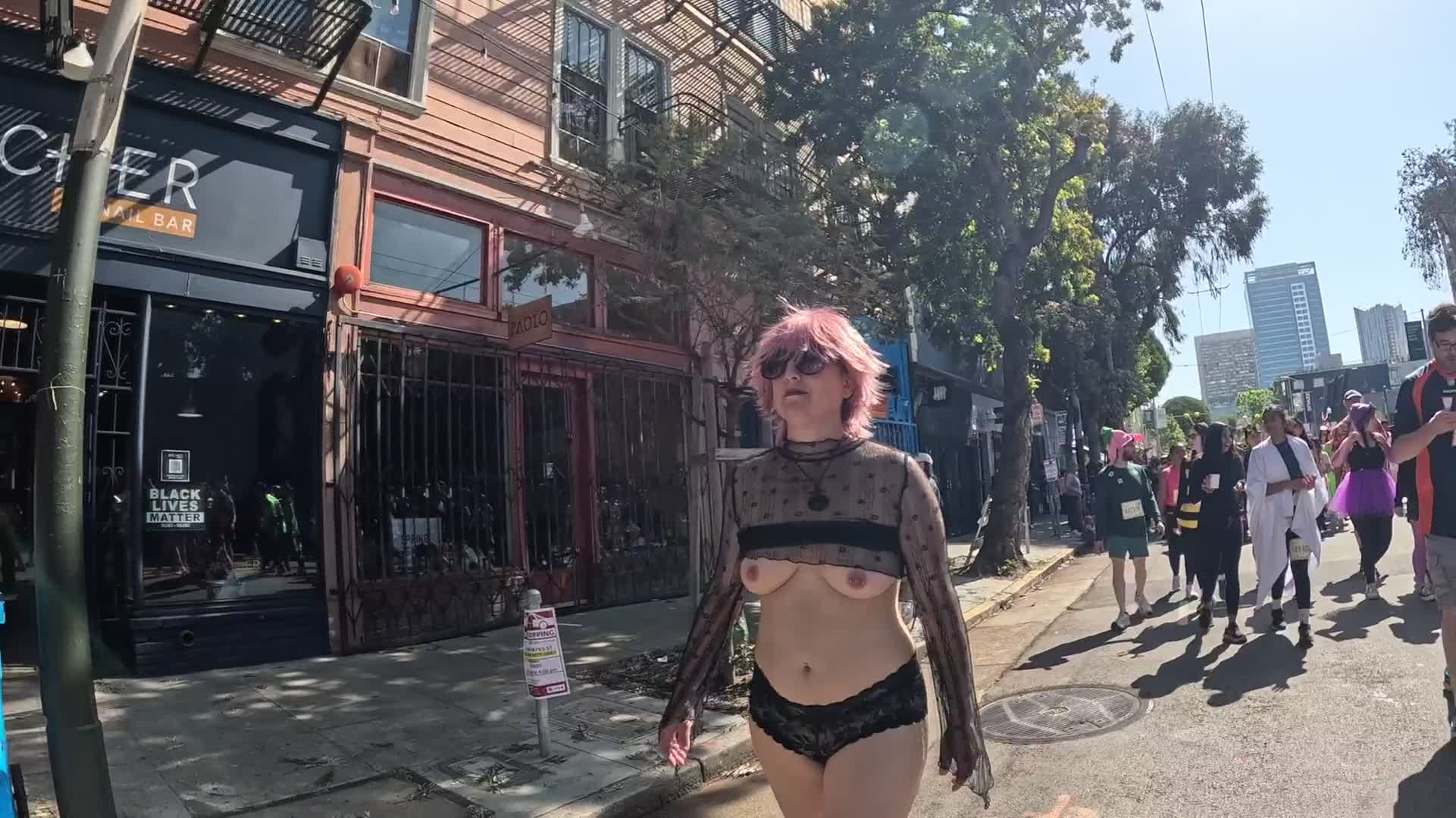 Женщина идет с обнаженной грудью по многолюдной улице.