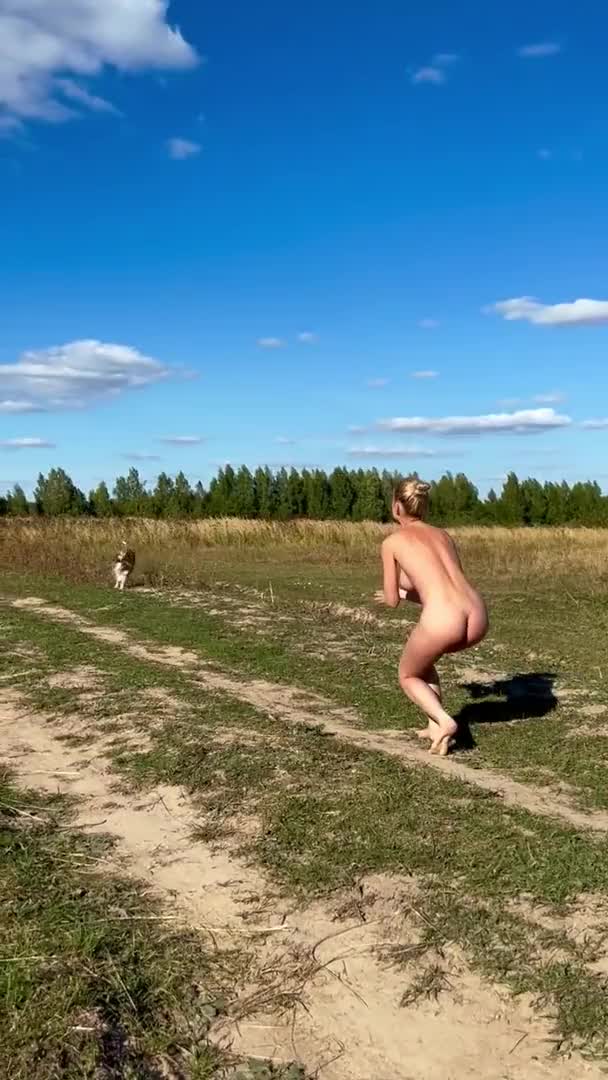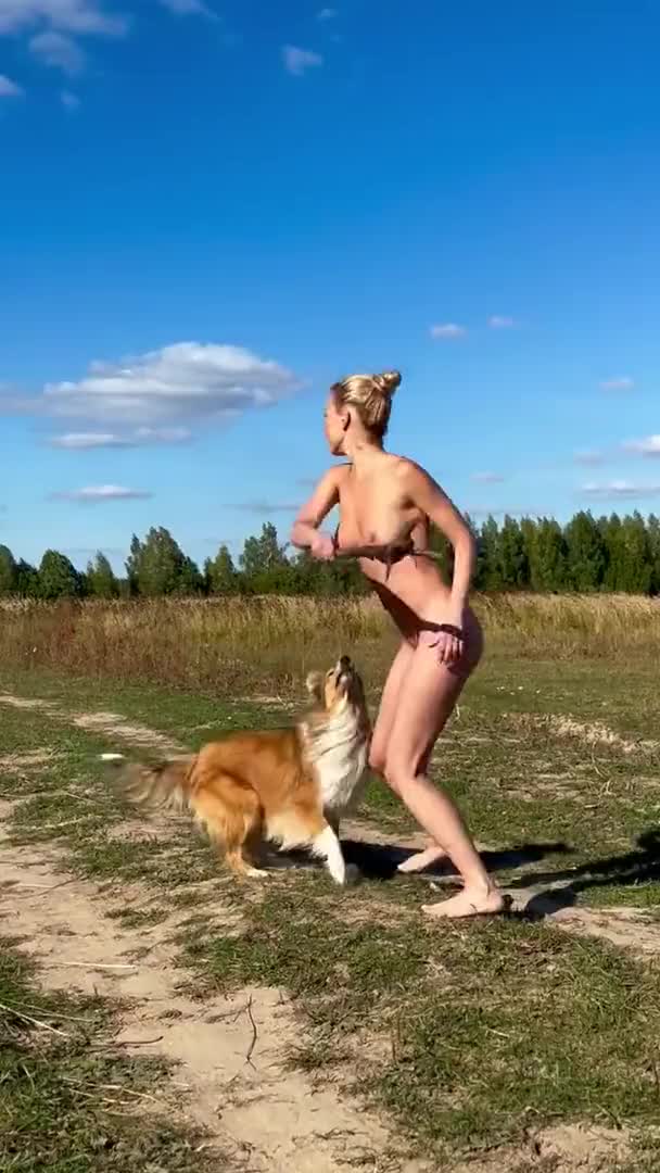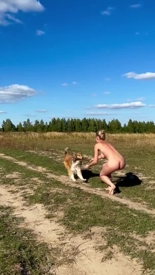 Голая жена на природе играет с собакой