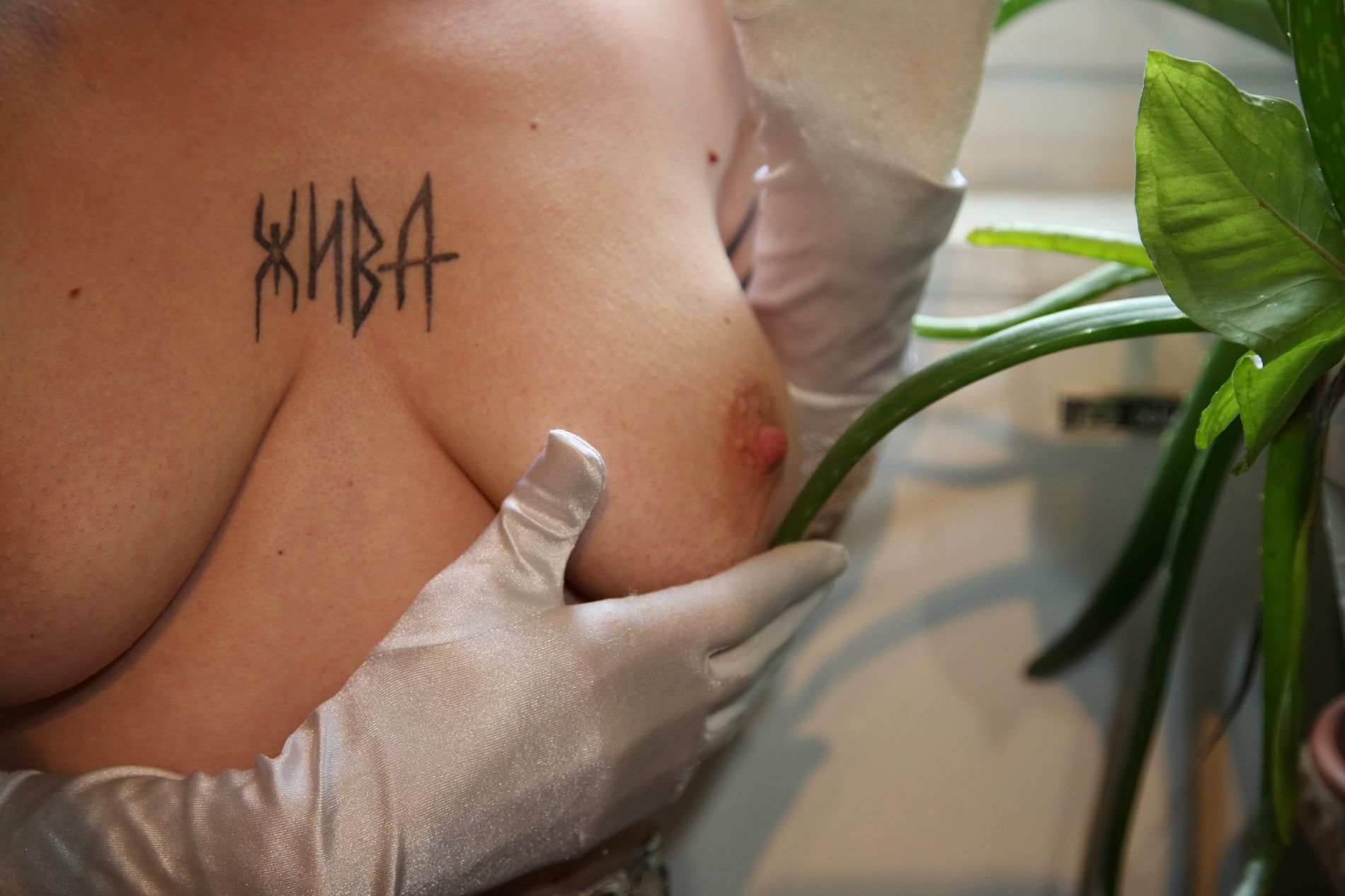Ирина демонстрирует свое тело, покрытое несколькими значительными татуировками.