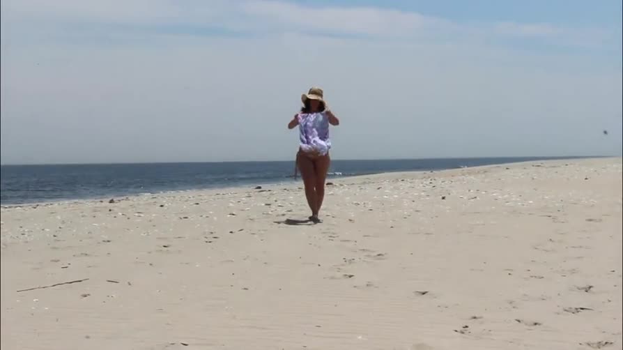 На пустынном берегу позирует красотка, показывая себя со всех сторон.