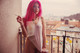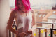 девушка-модель с розовыми волосами и проколотыми сосками. тату много