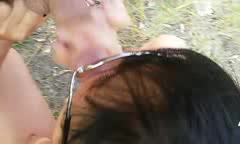 Жена делает миньет на природе