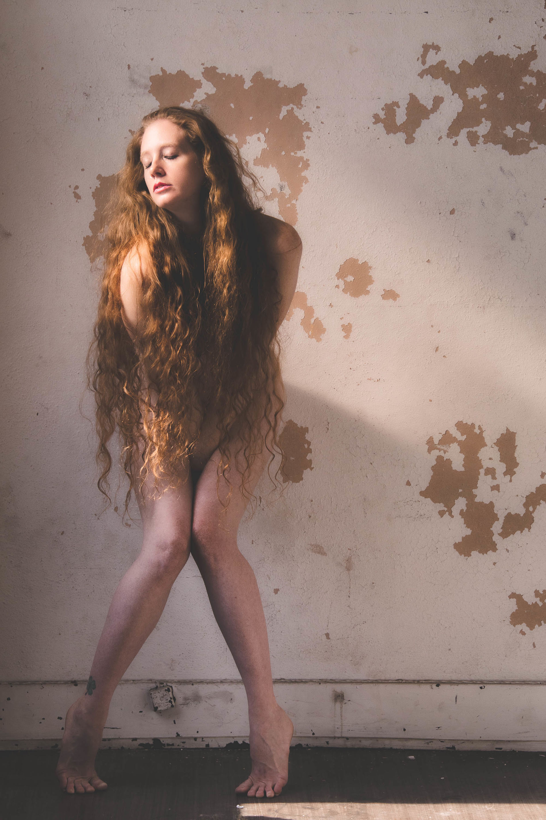 рыжая на фоне облезшей стены. красиво снято