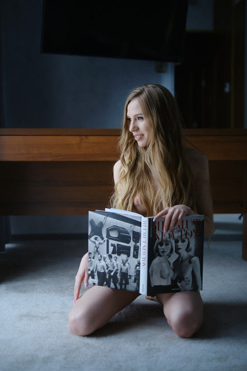 Длинноногая блондинка изящно изгибается с любимой книжкой снимая с себя все лишнее