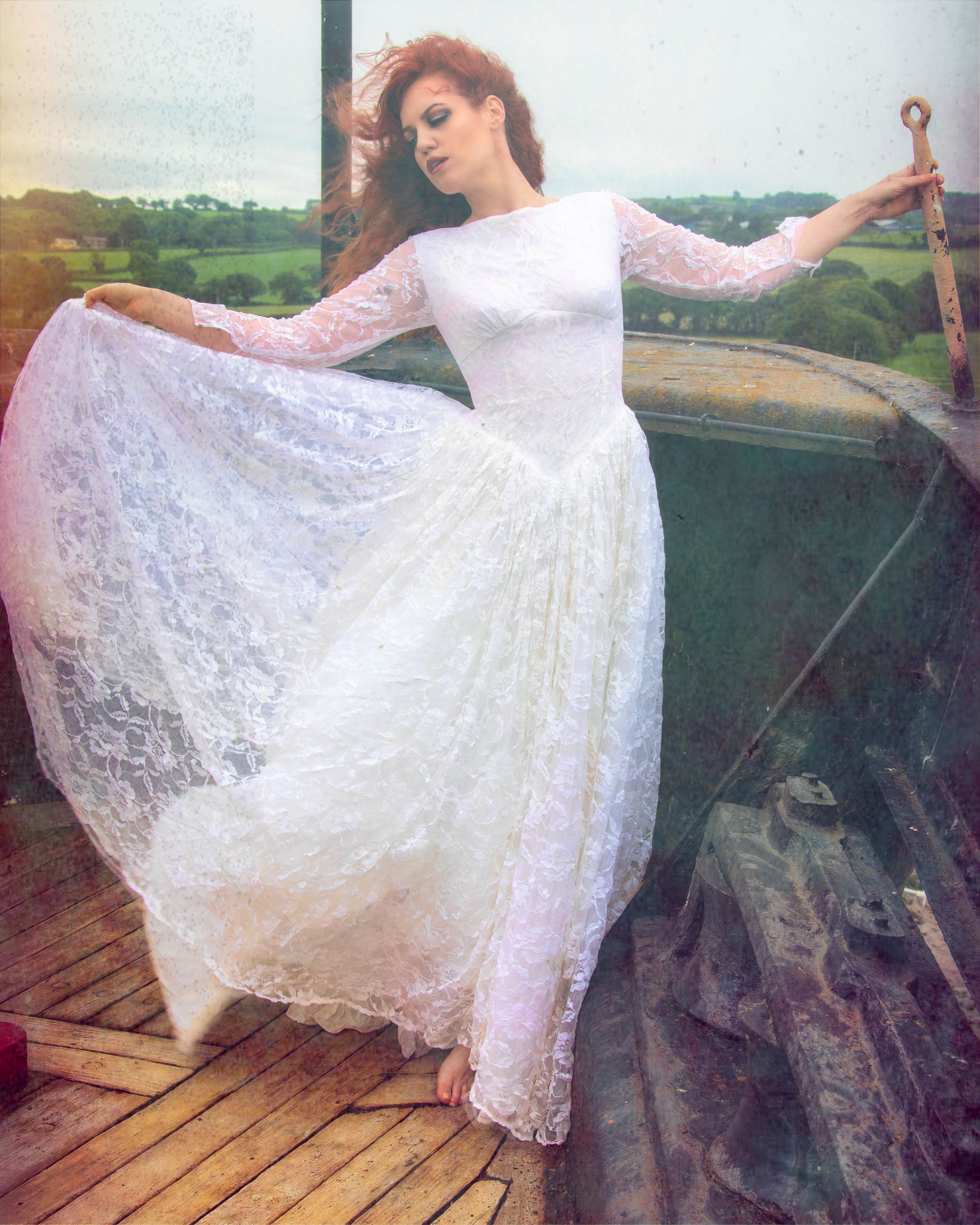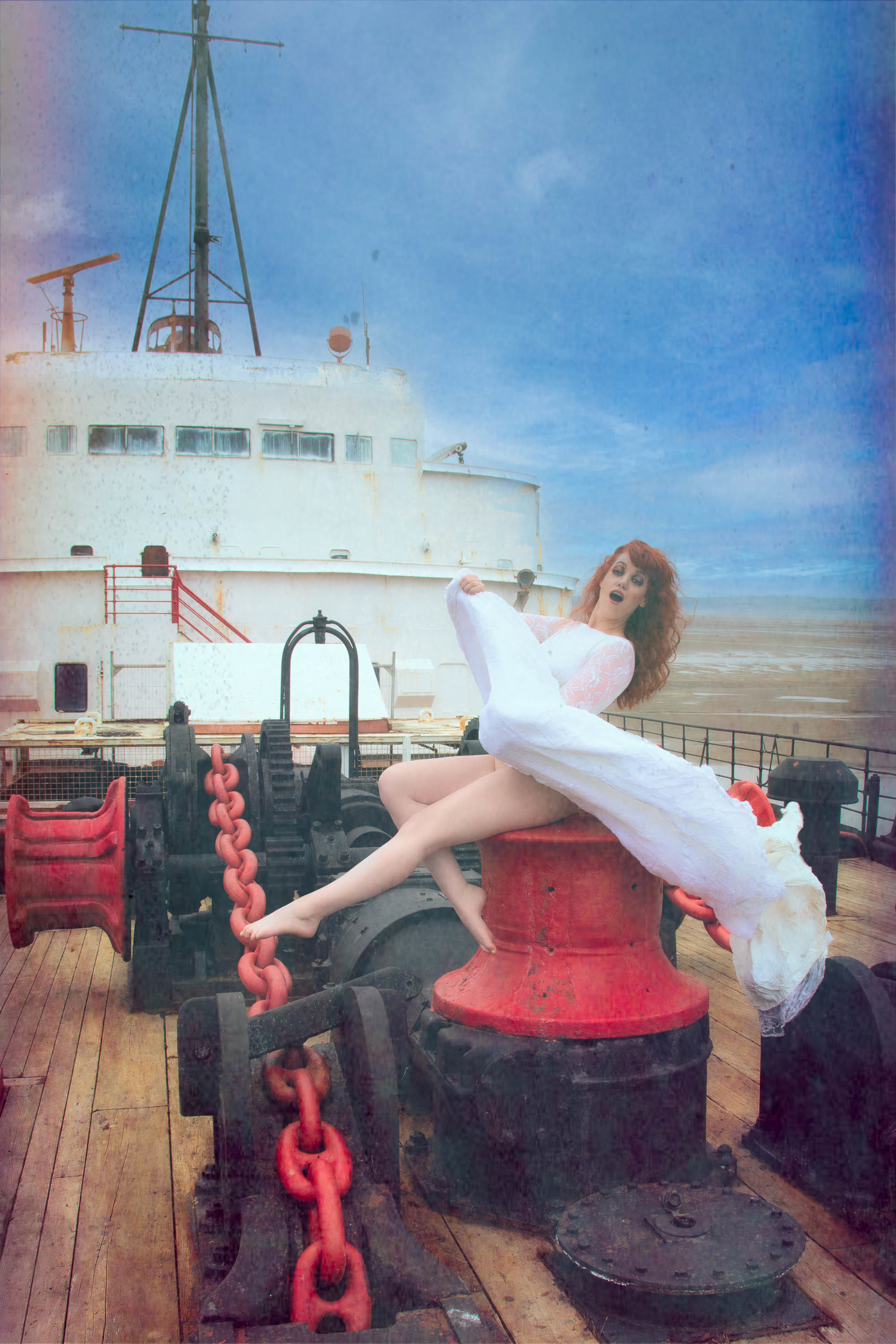 рыженькая американка, типаж модели простушка. а корабль не яхта но ухоженный- дедовский, палуба деревянная