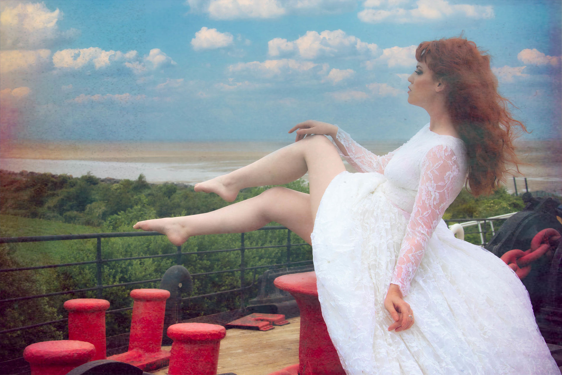Рыжеволосая красавица позирует на борту морской яхты.