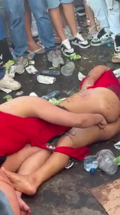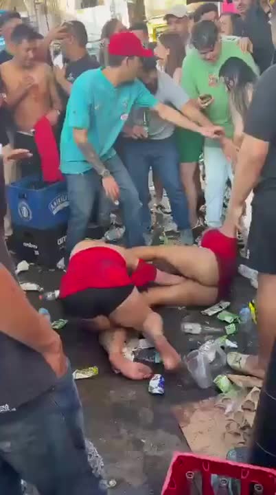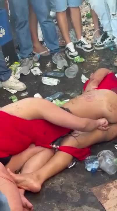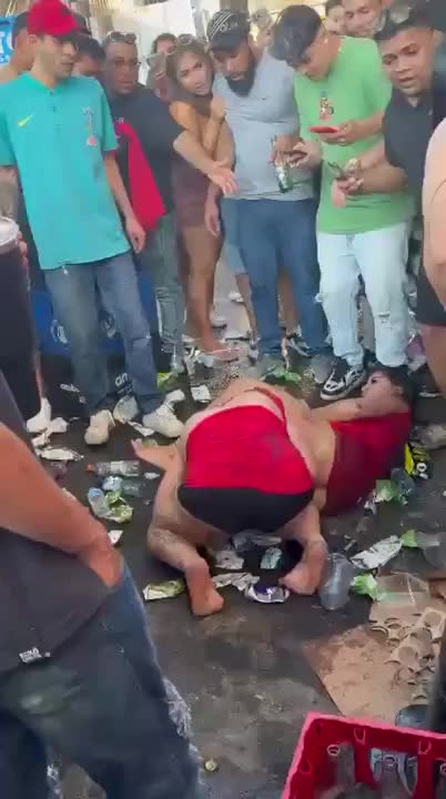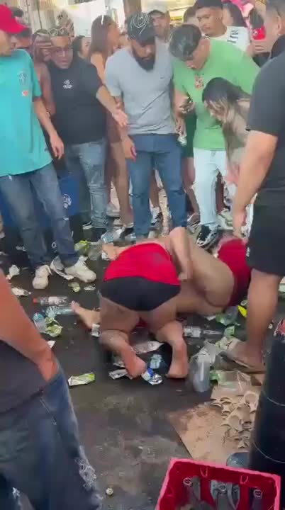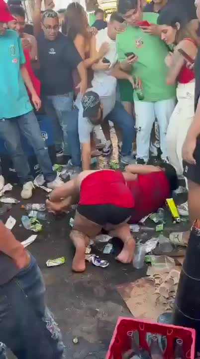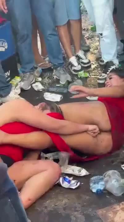 Девочки дерутся среди мусора, а мальчики заключают пари о том, кто победит.
