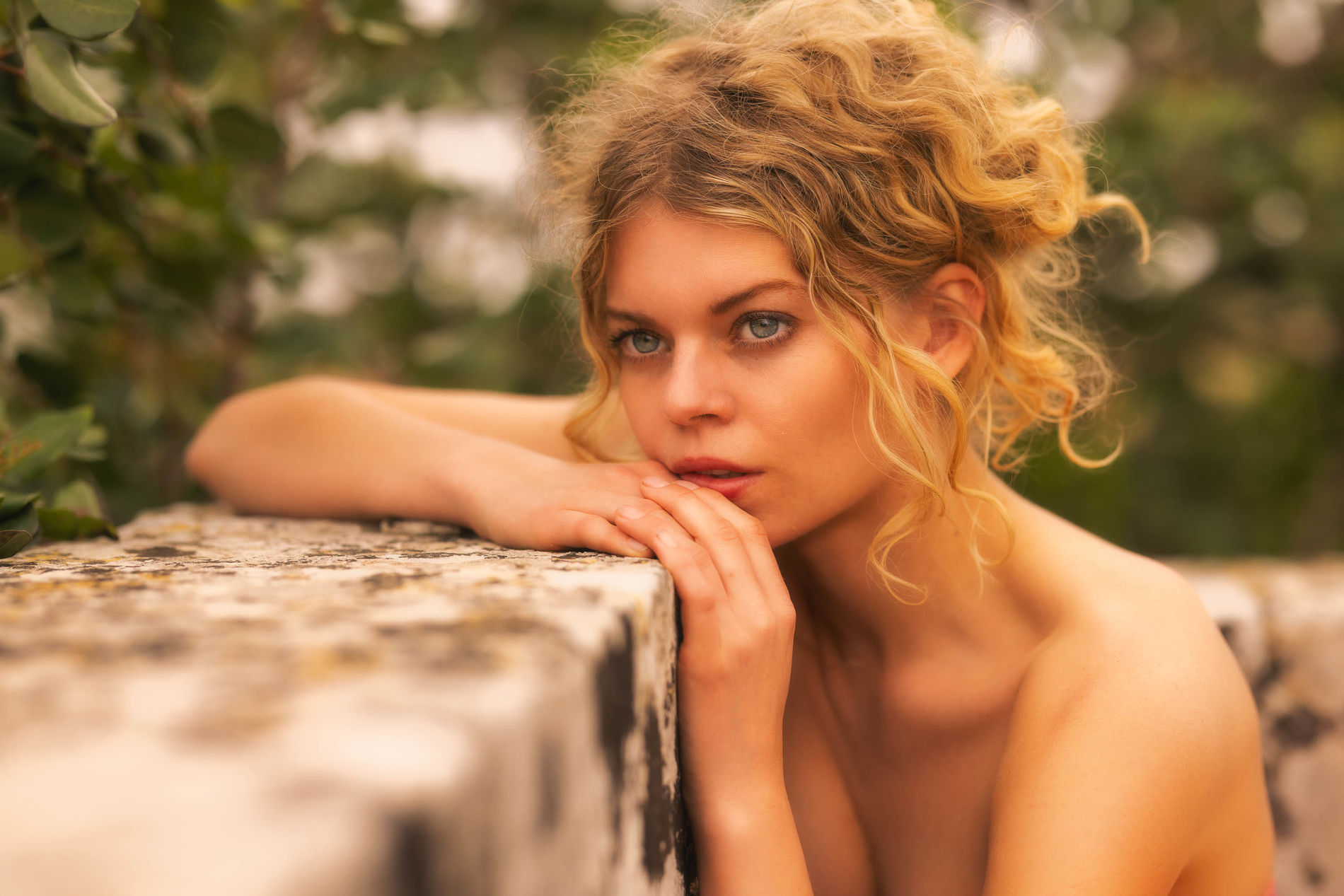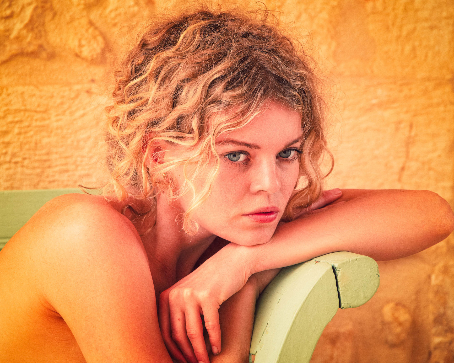 Очаровательная блондинка прижалась к стене и села на скамейку.