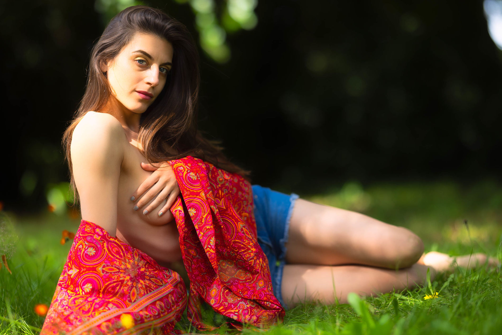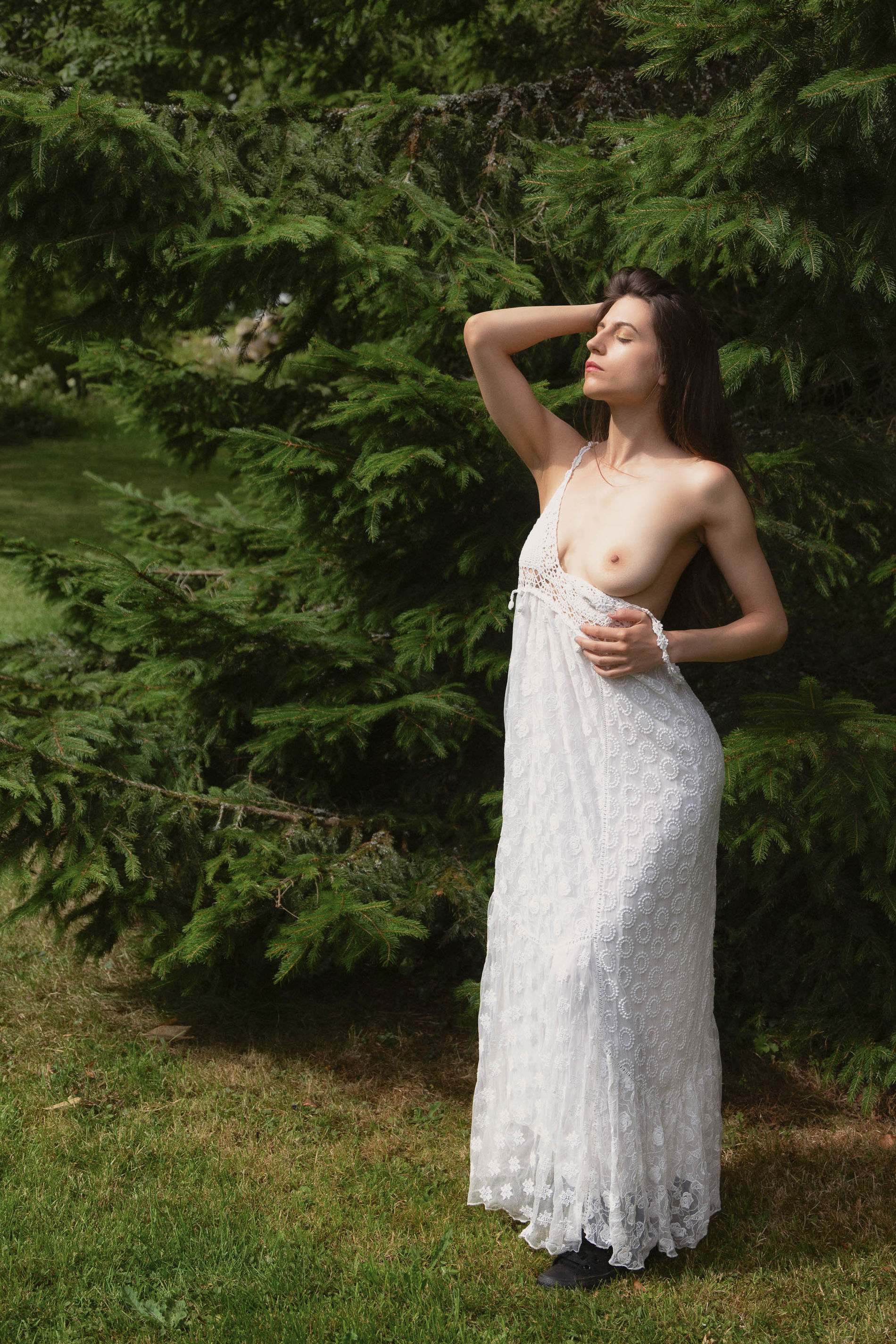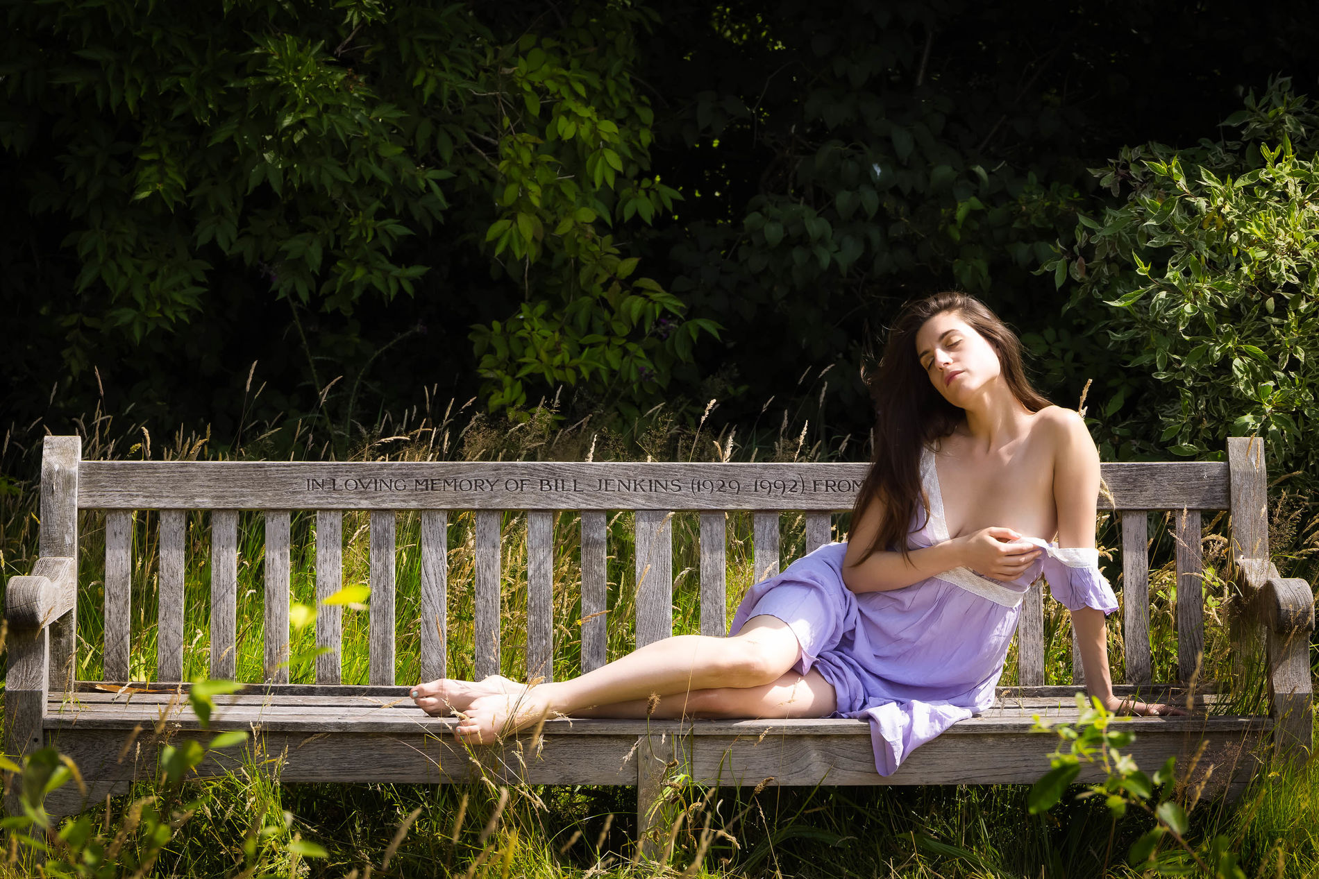 Привлекательная девушка демонстрирует свою наготу в парке.