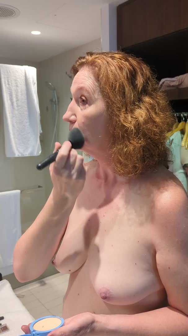 Женщина зрелого возраста наносит макияж перед зеркалом.