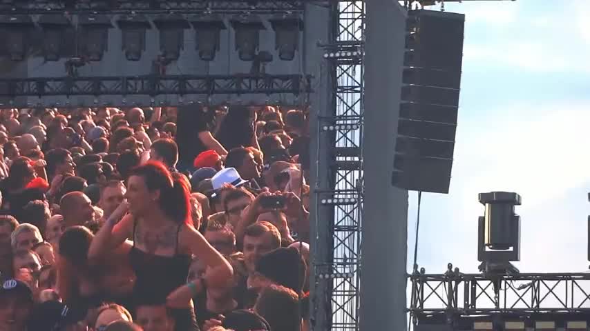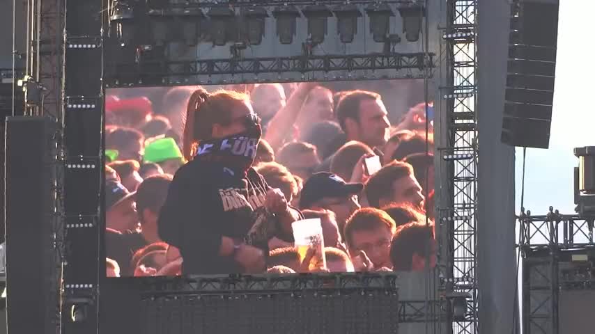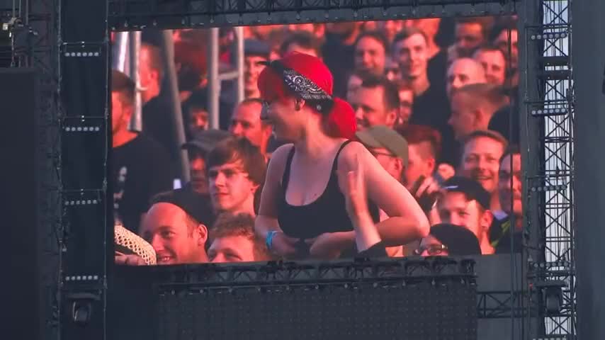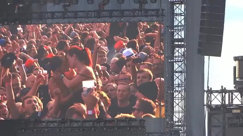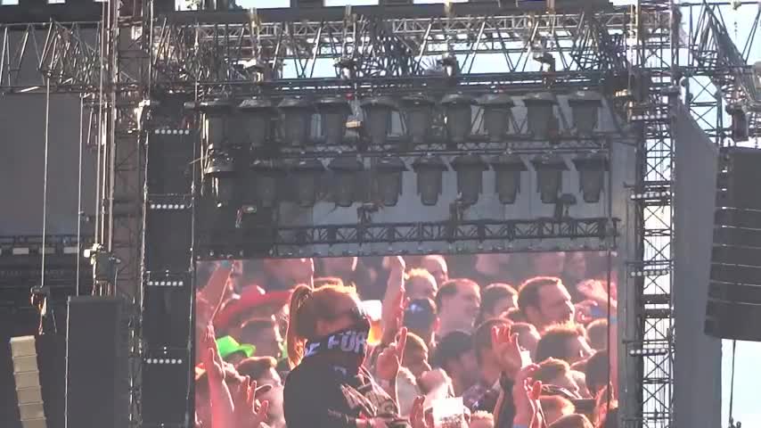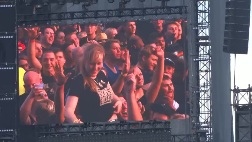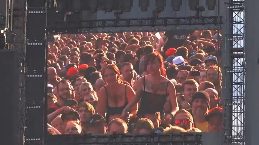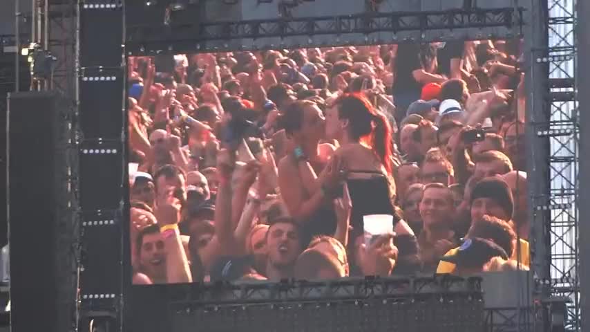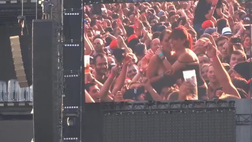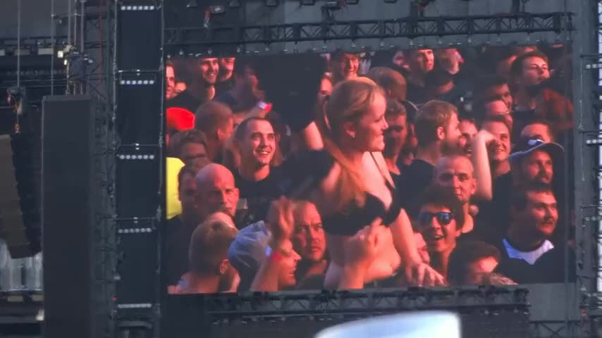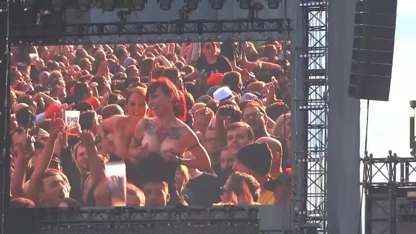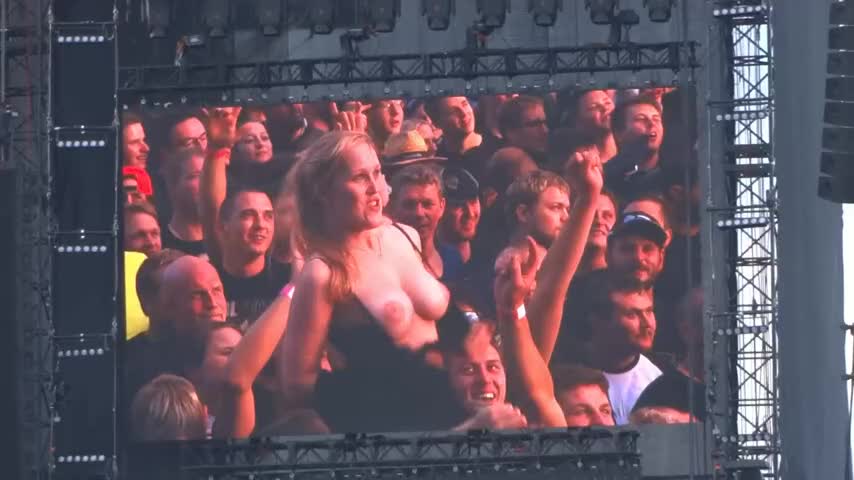 Веселые девушки показавают свои сиски на экране во время концерта к восторгу всей публики.