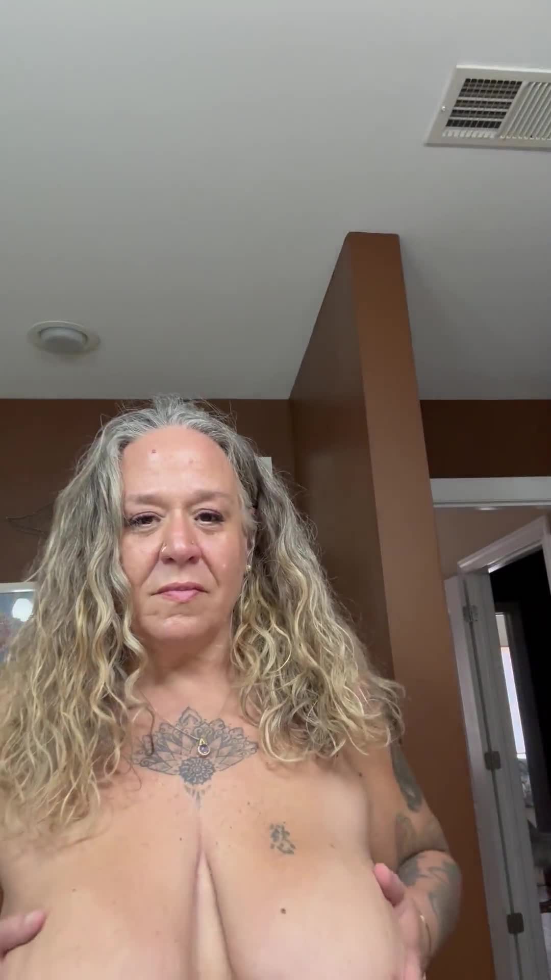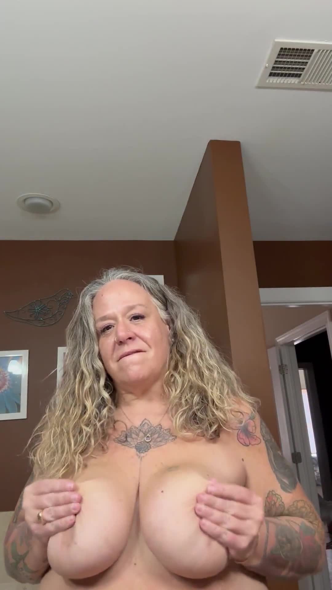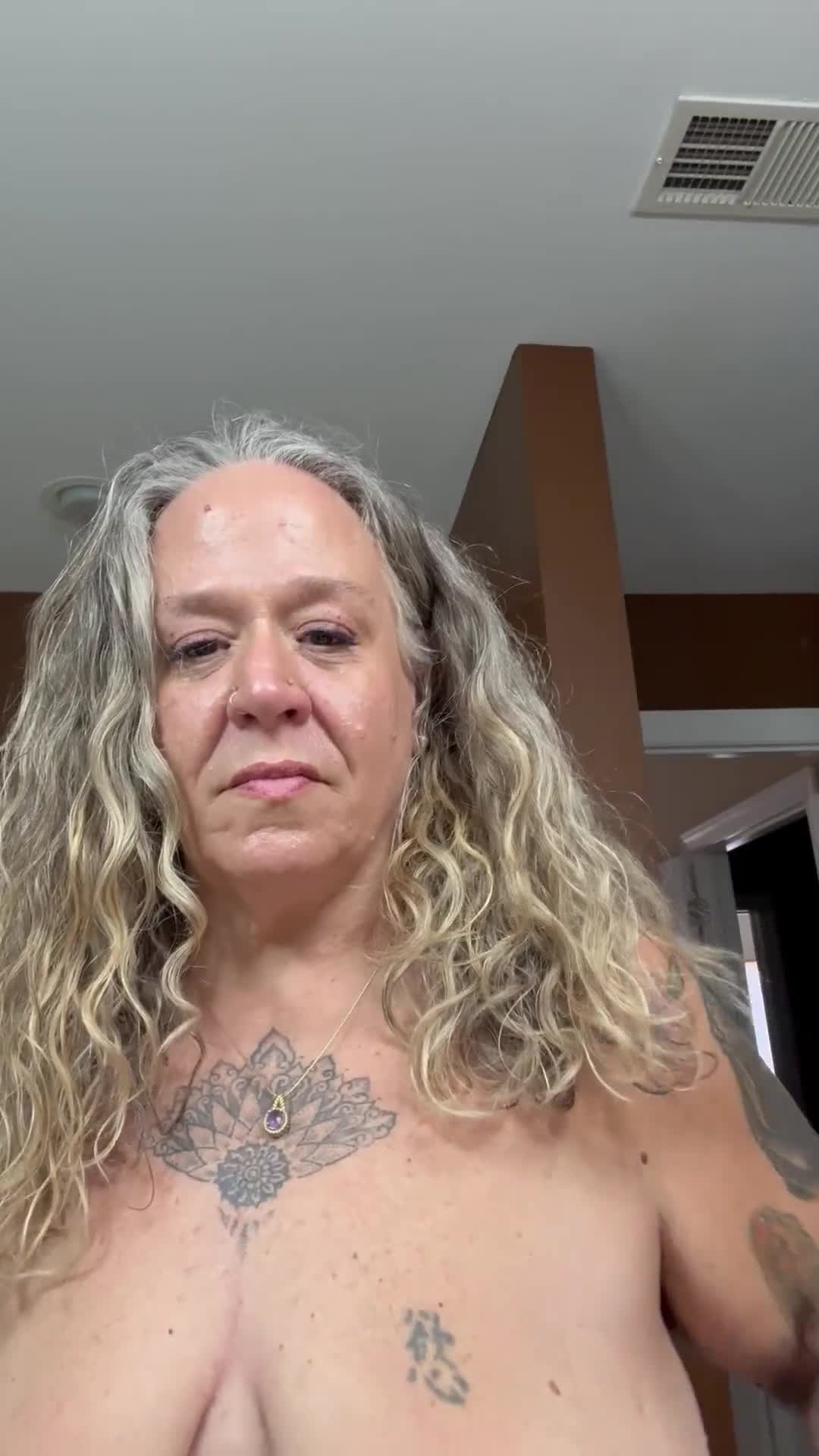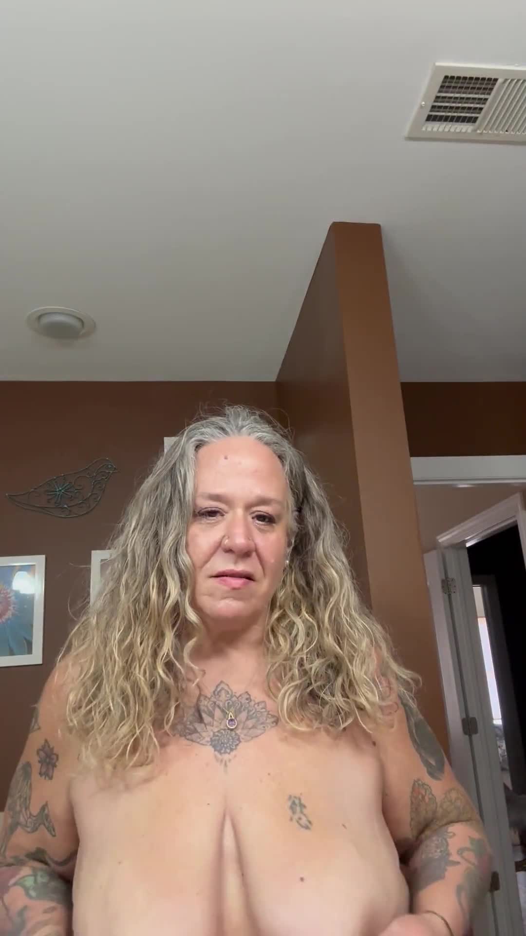 Пожилая женщина с длинными кудрявыми волосами и татуировками демонстрирует свою грудь.