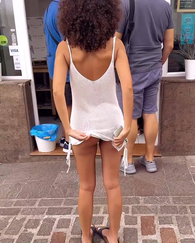 Ходит на улице в коротком платье на голое тело.