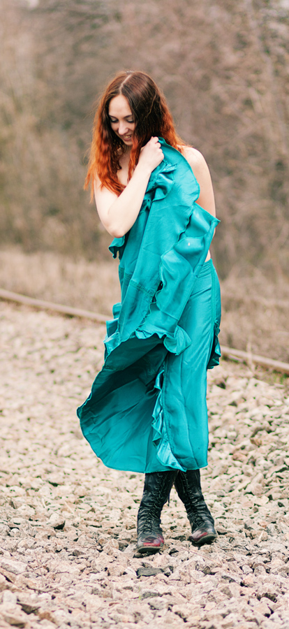 На этом сером фоне.Её яркая копна волос так и горит.А юбка интересная.Будто за ней гнались.И юбку рвали.