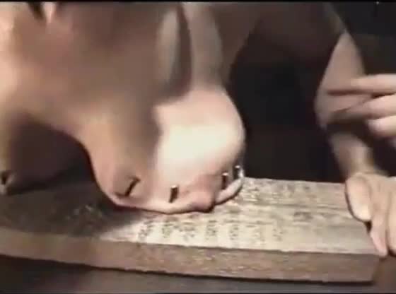 Строгая госпожа прибивает грудь своей рабыни гвоздями к доске и использует её как полку. Она также кусает несчастную женщину за клитор металлическим зажимом.