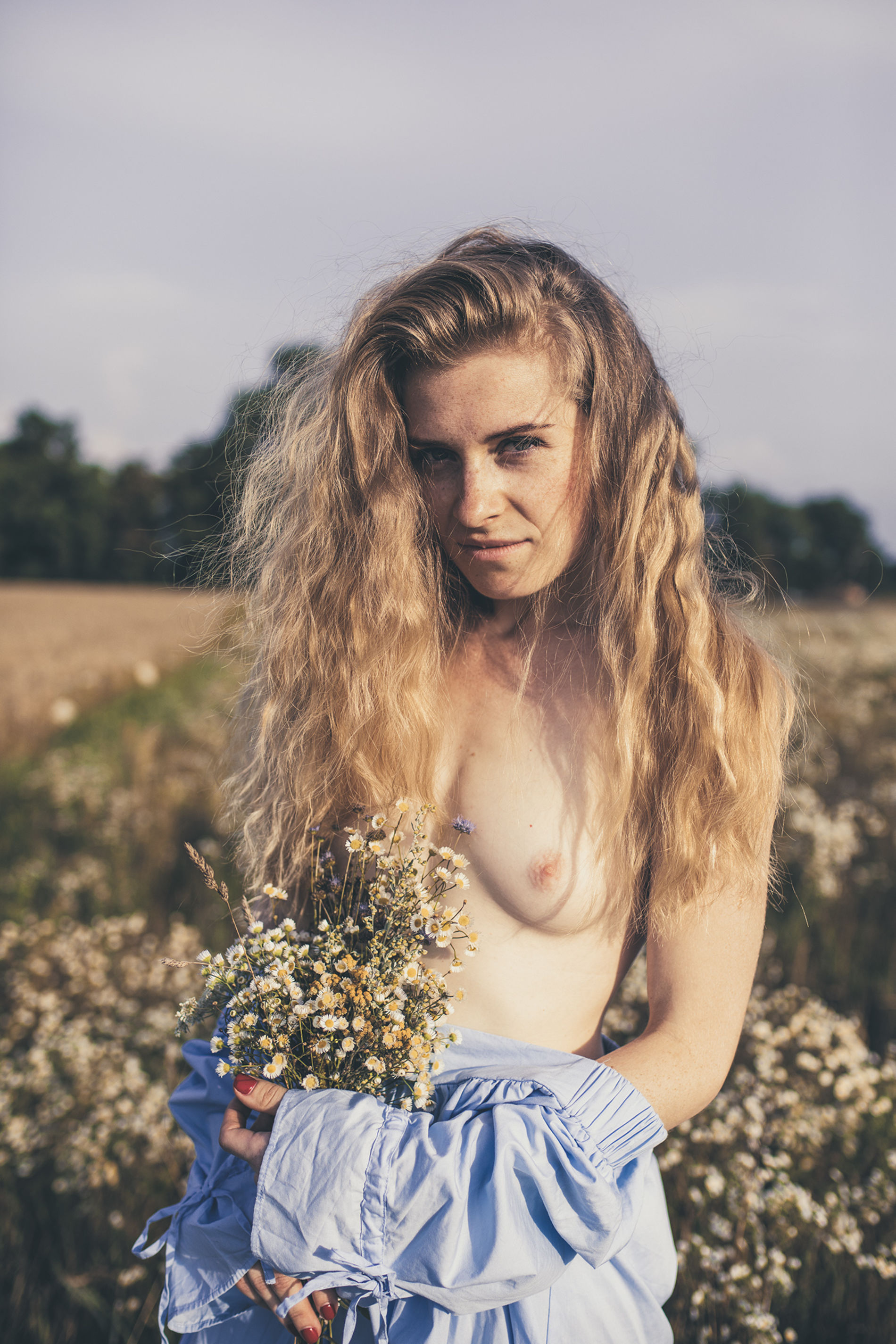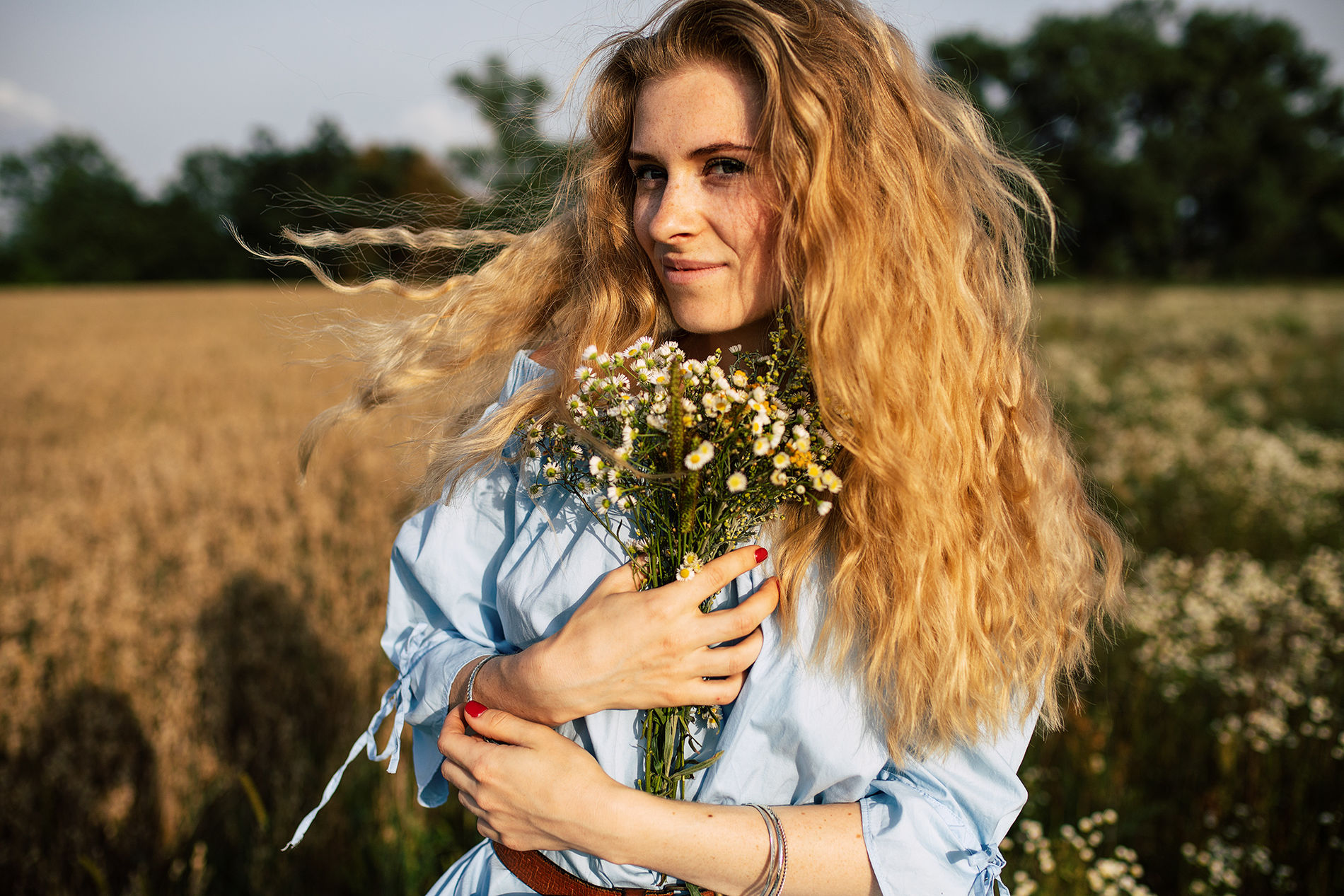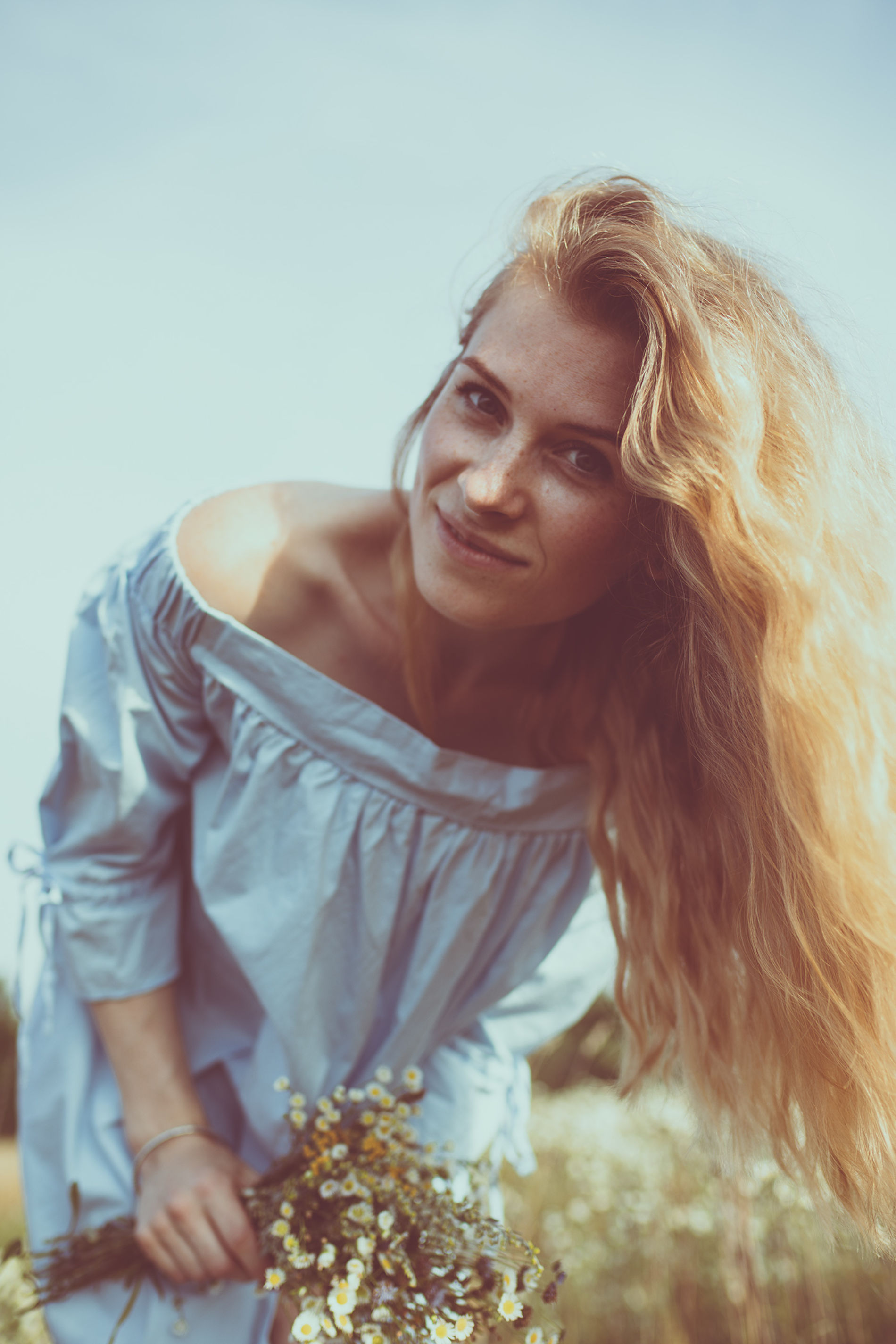Длинноволосая блондинка с букетом полевых цветов