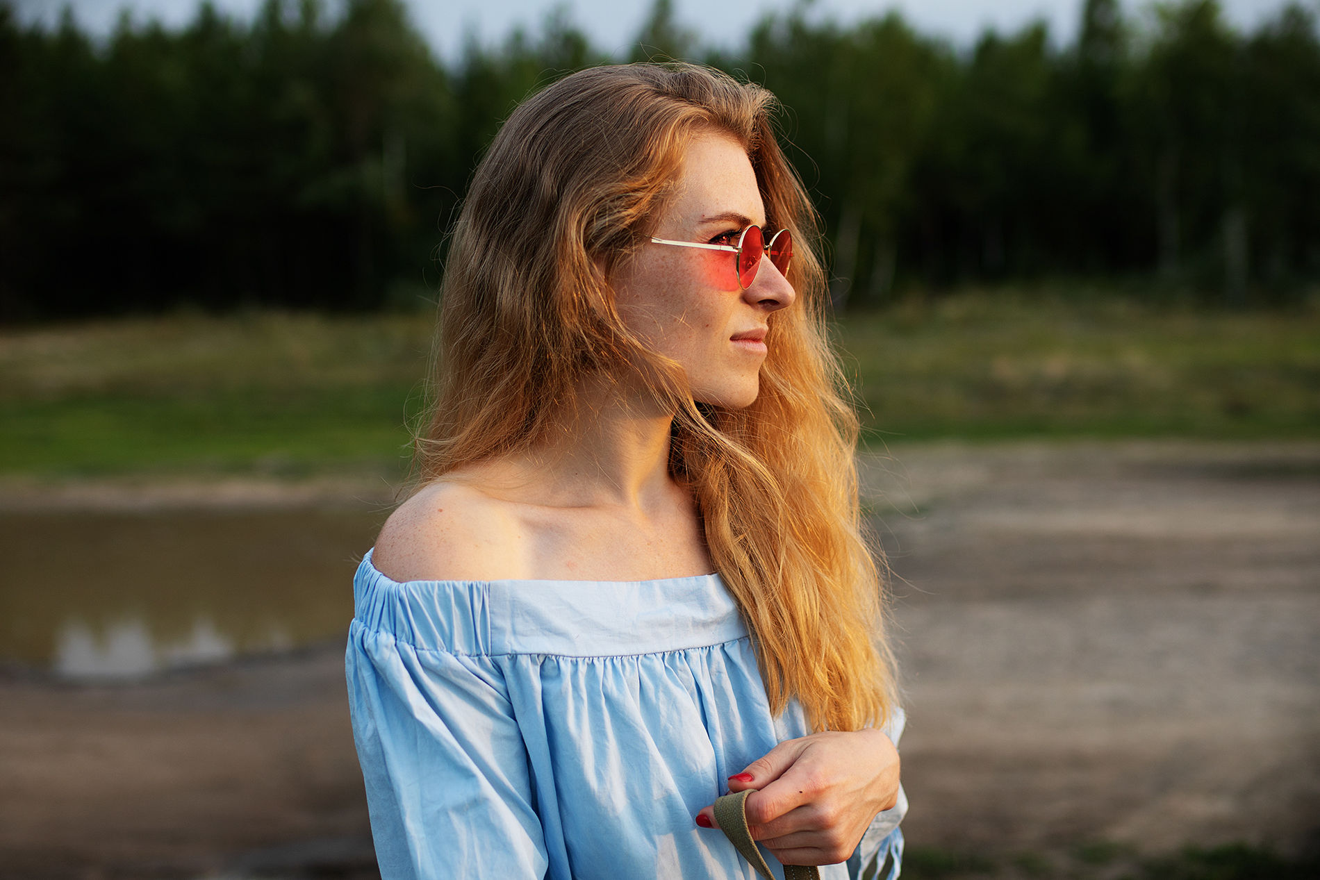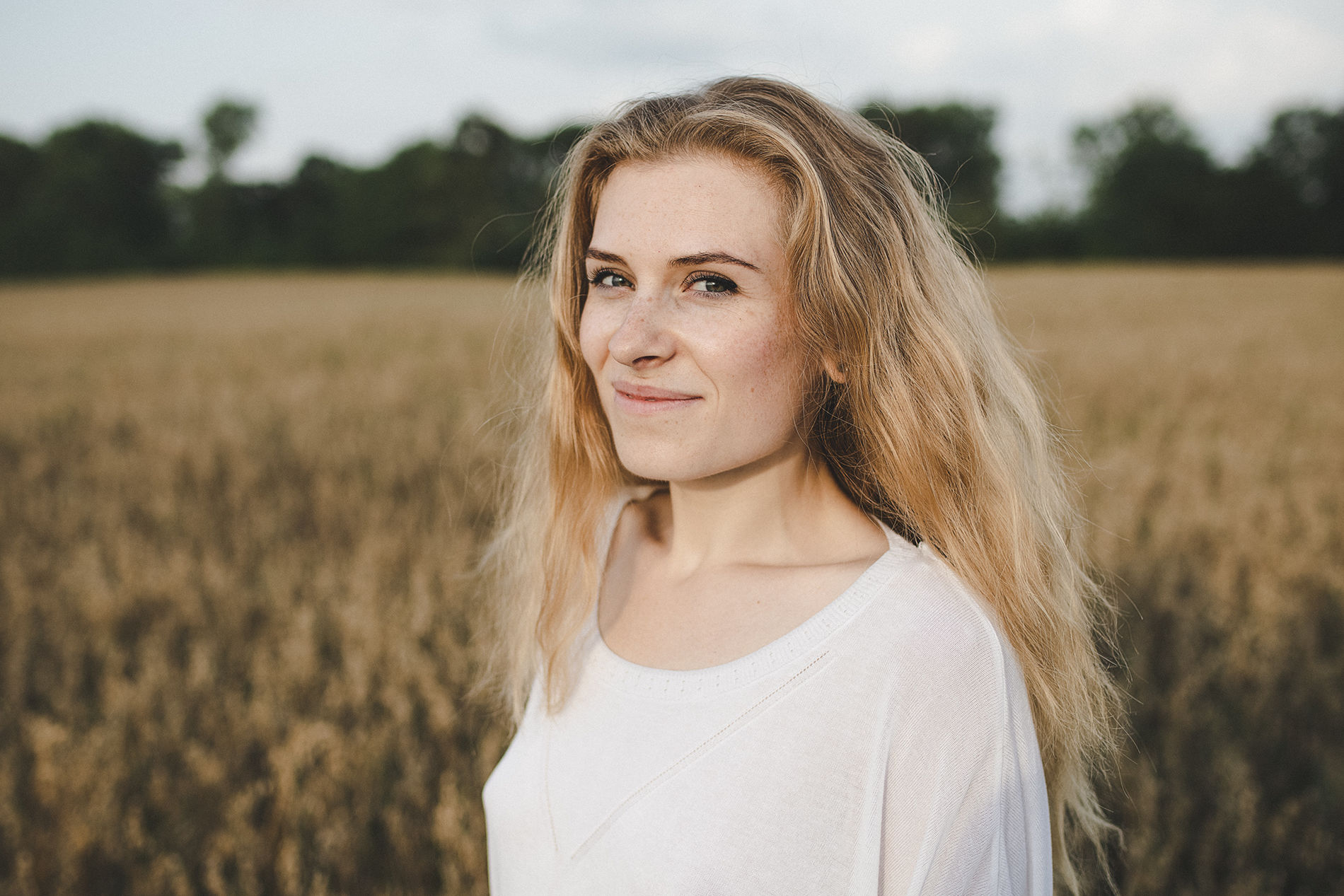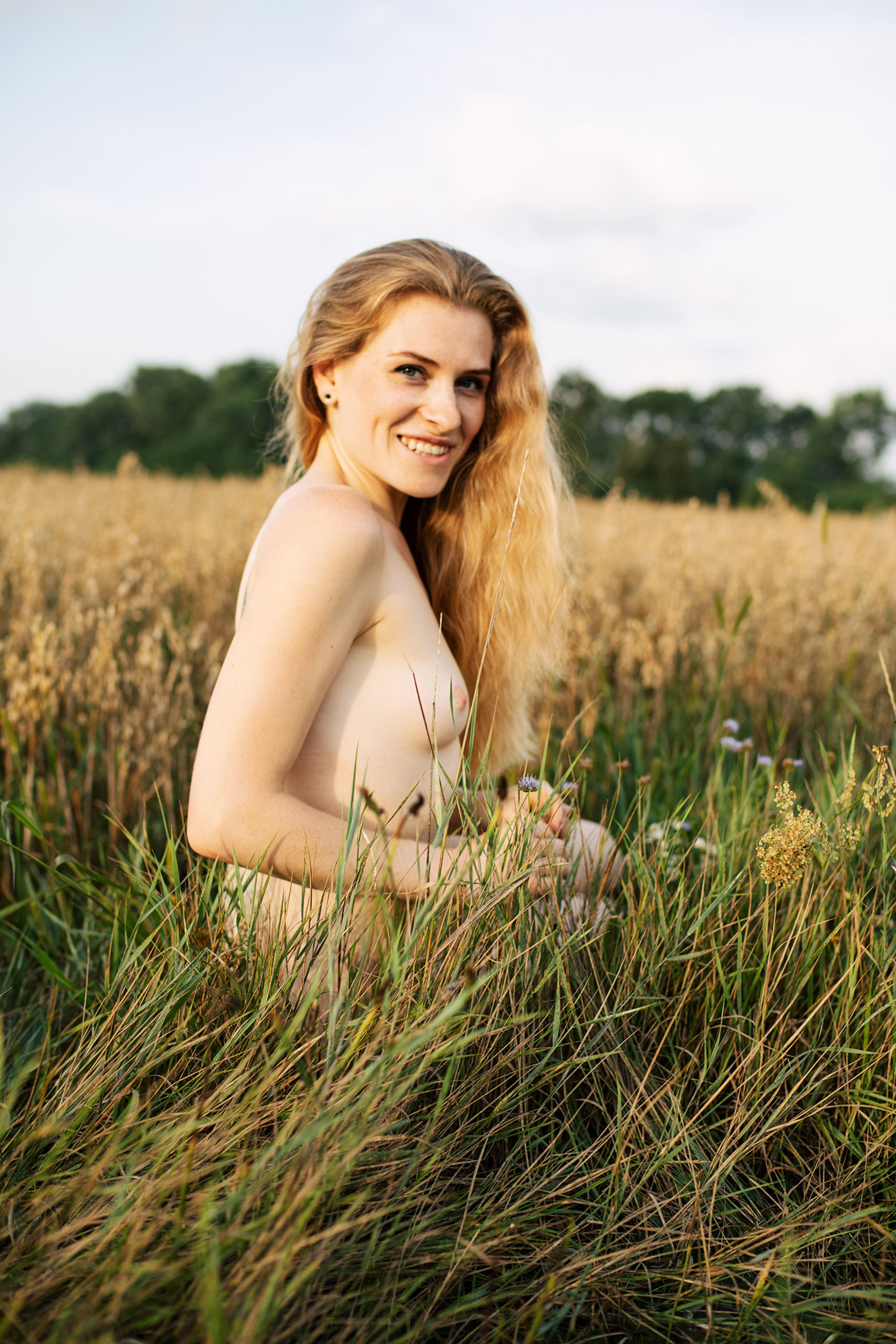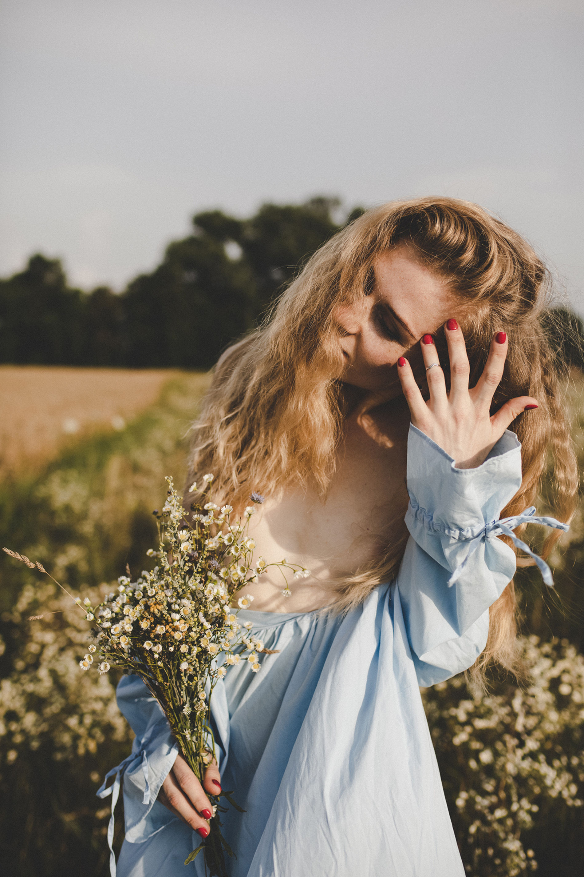 Длинноволосая блондинка с букетом полевых цветов