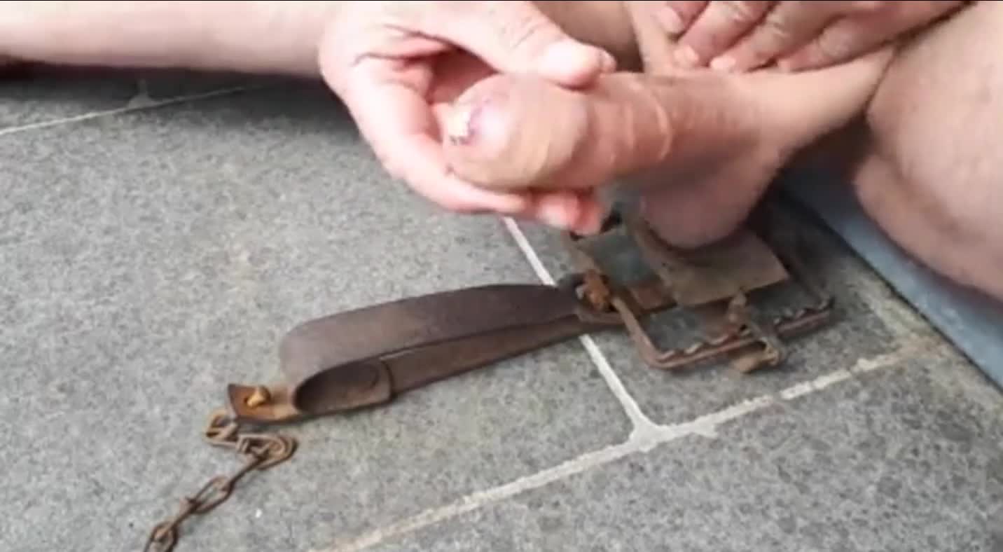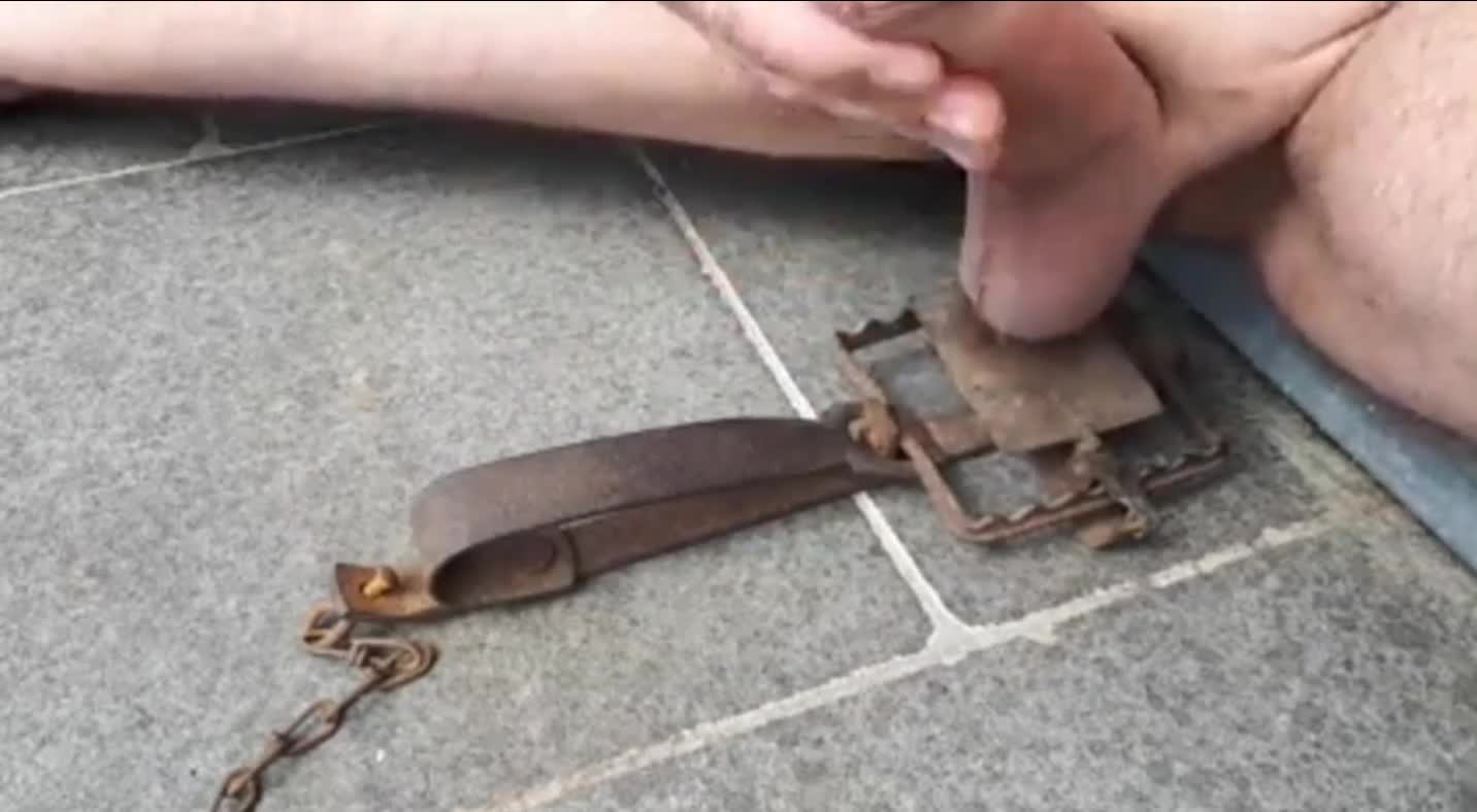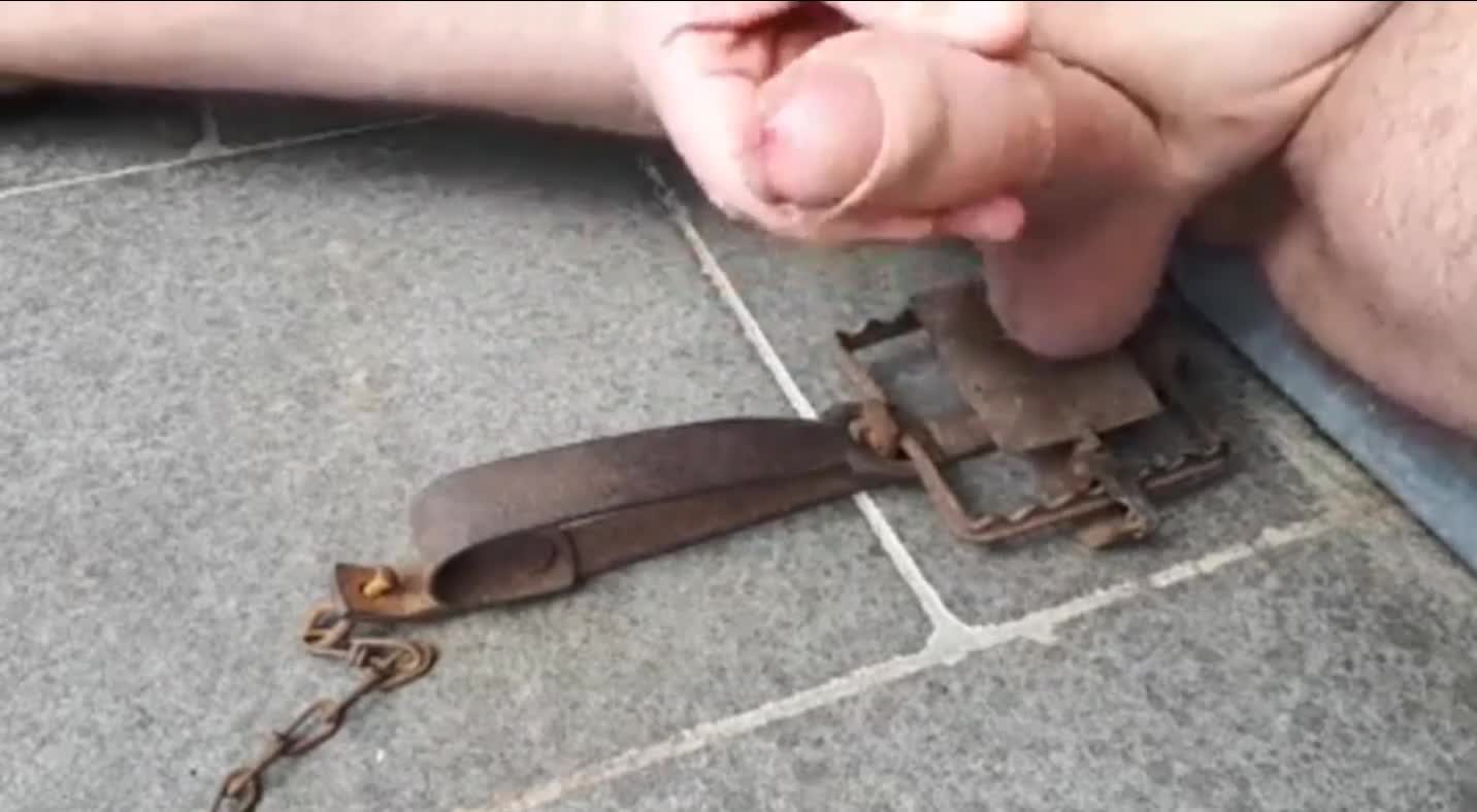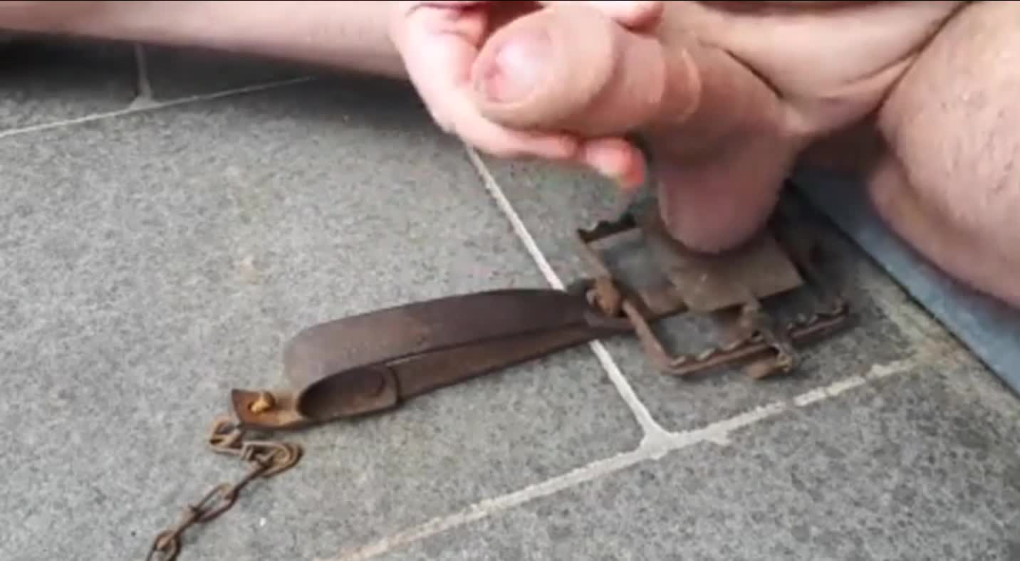 Любитель боли эякулирует, когда его яички зажать в капкан для лись.