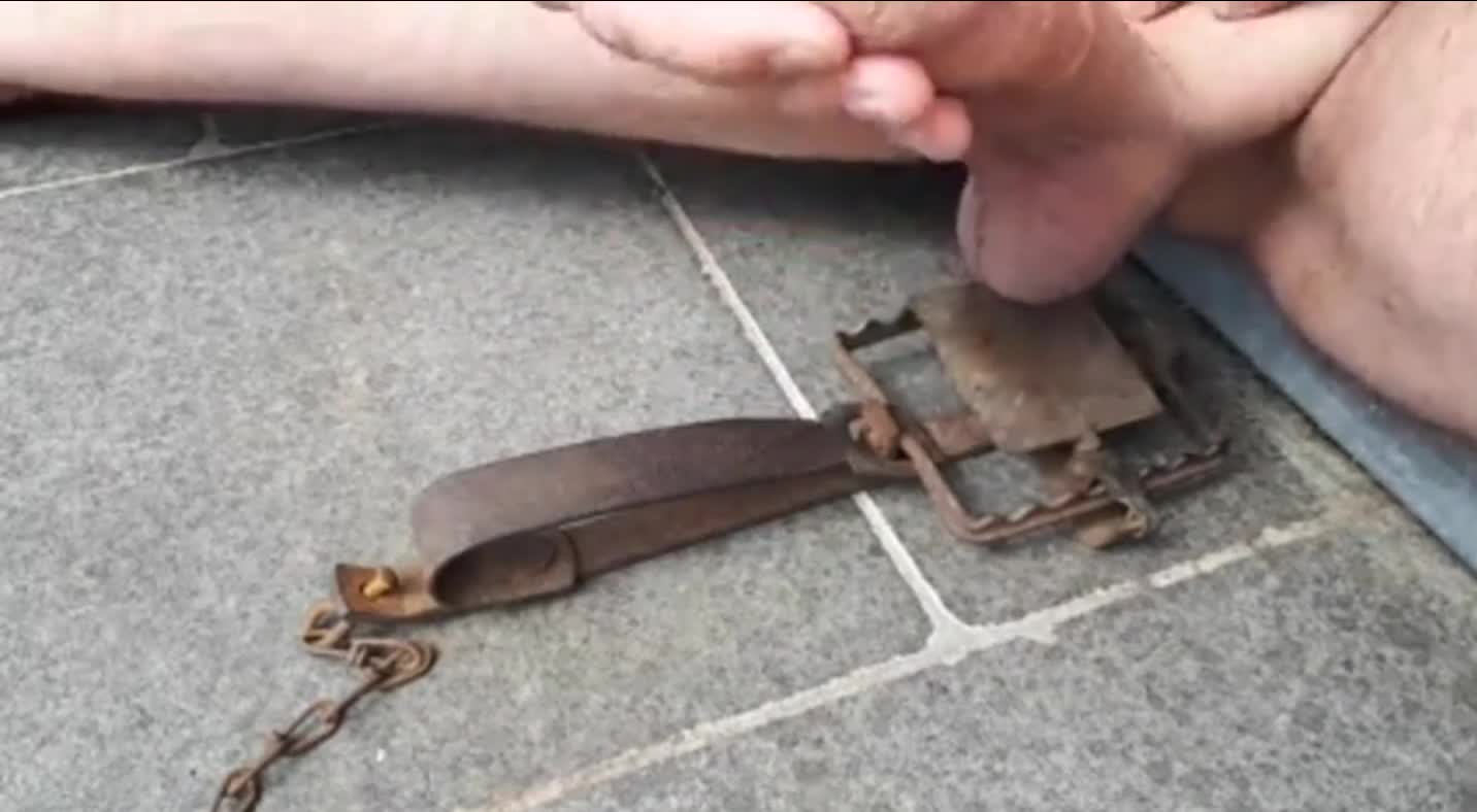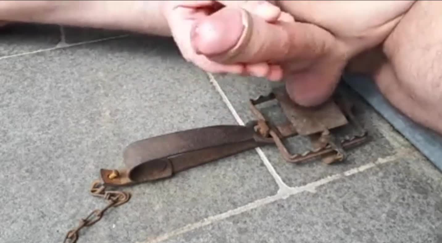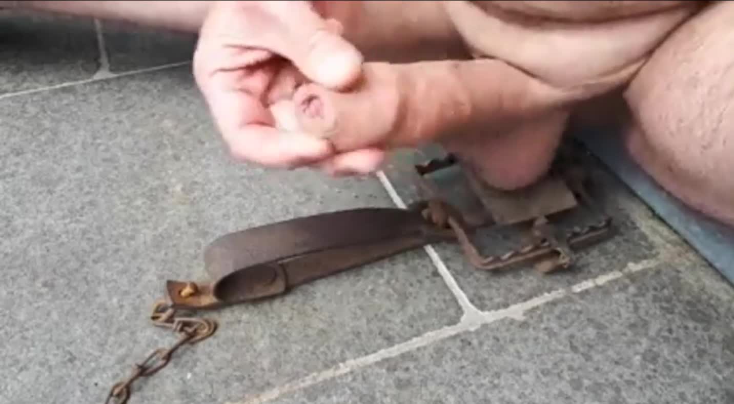 Любитель боли эякулирует, когда его яички зажать в капкан для лись.