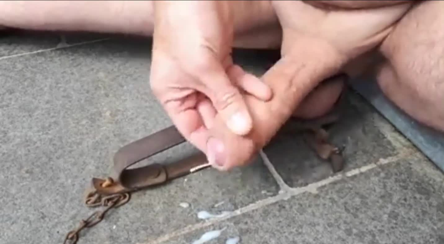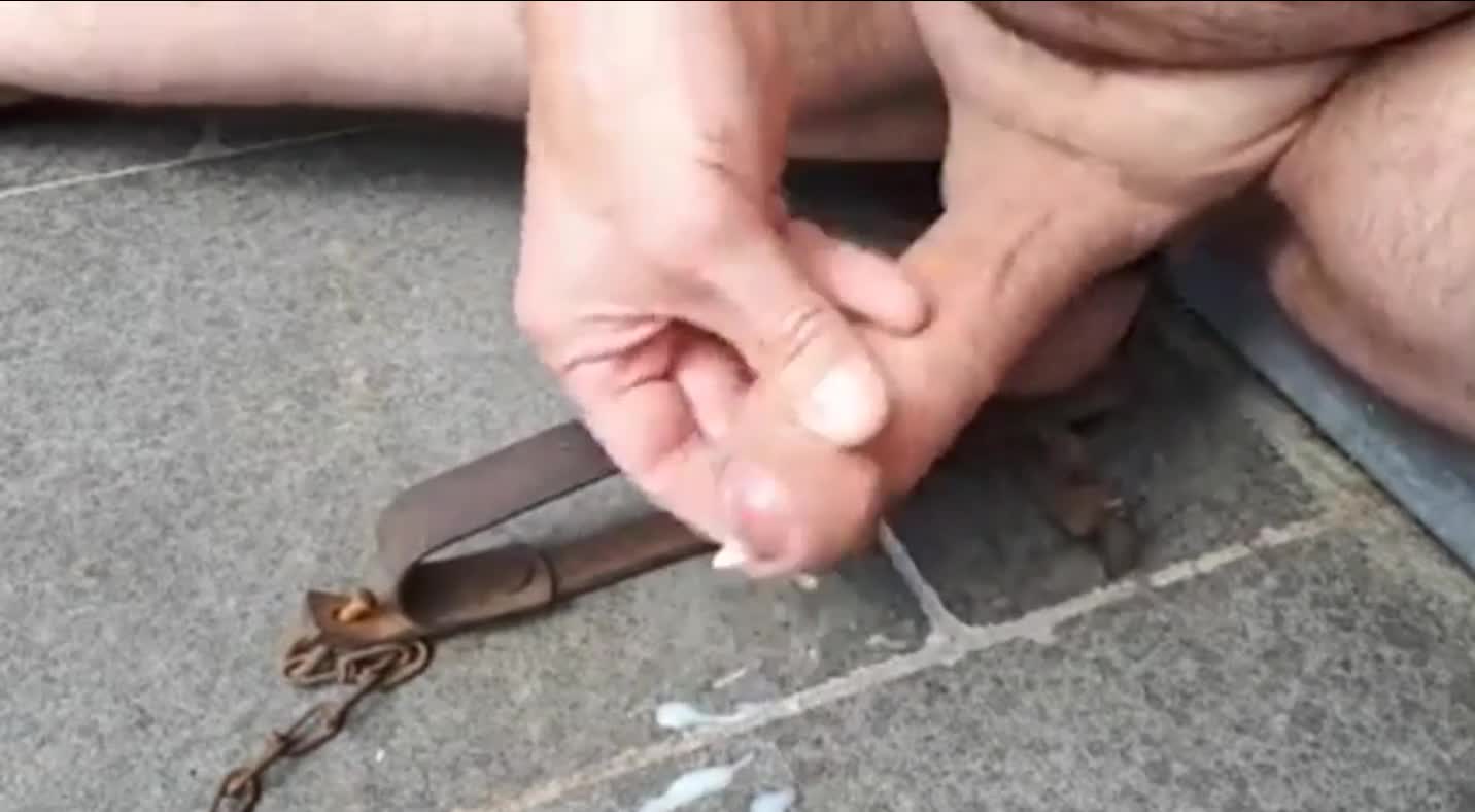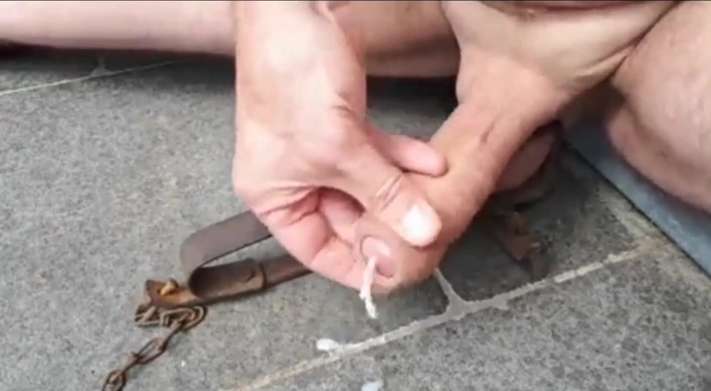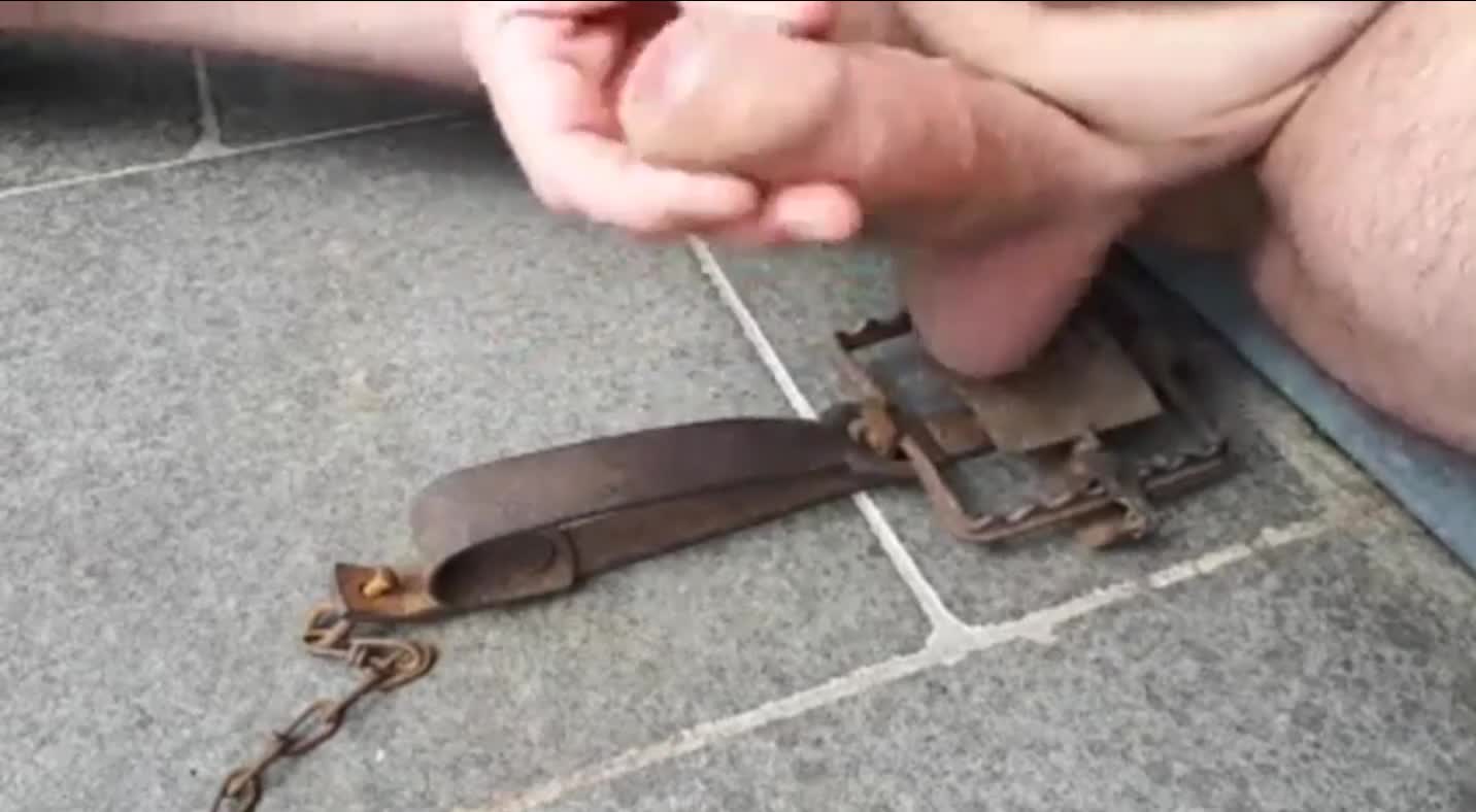 Любитель боли эякулирует, когда его яички зажать в капкан для лись.