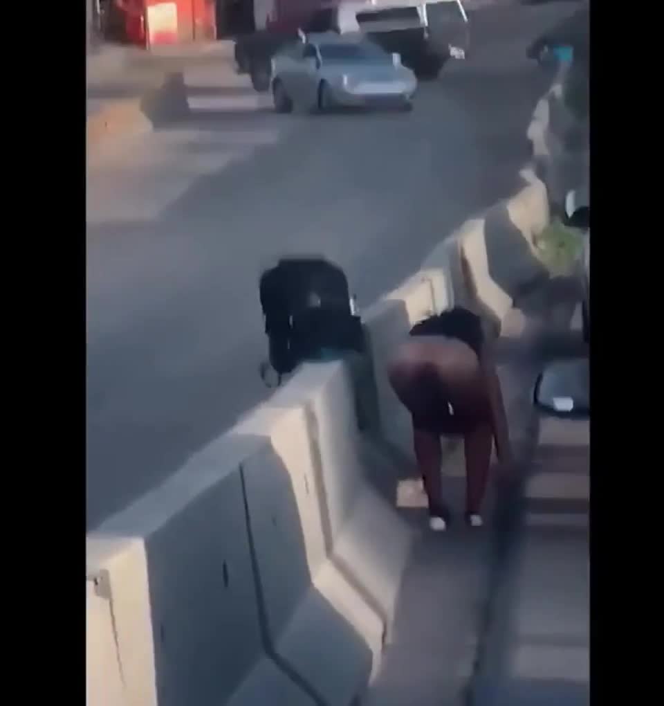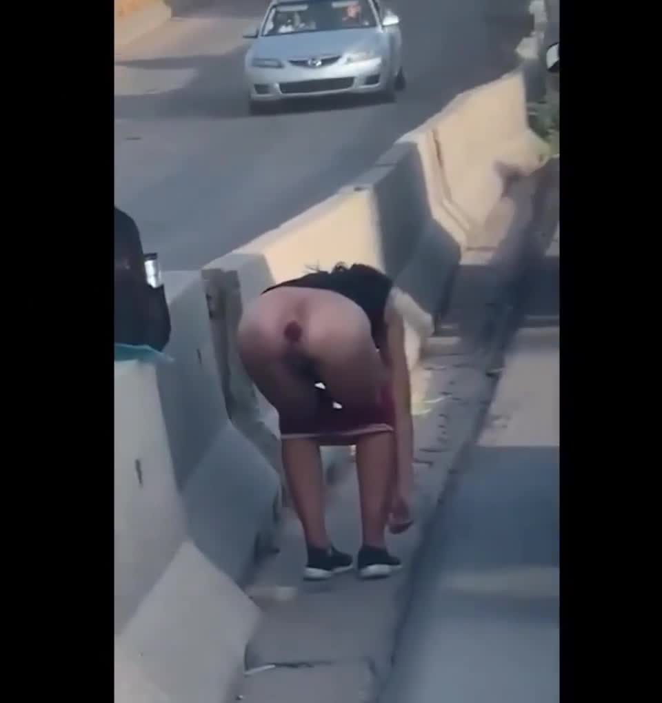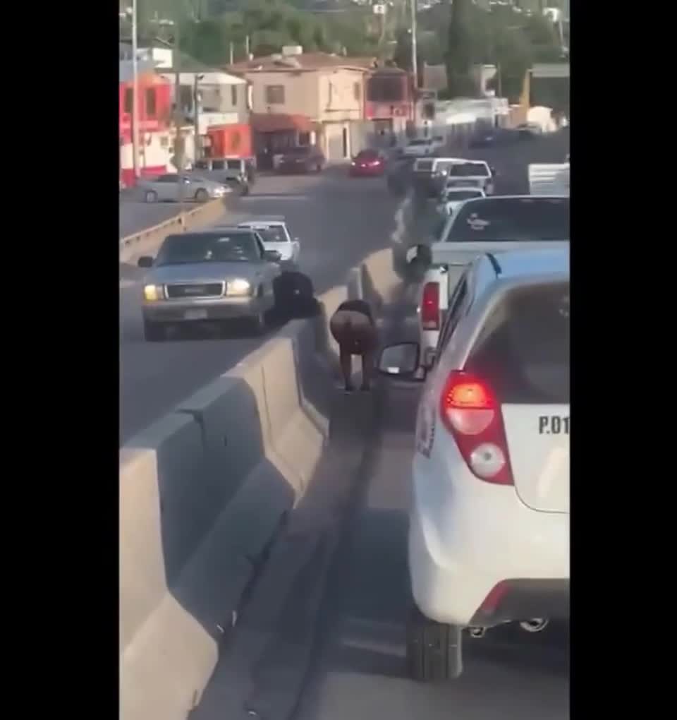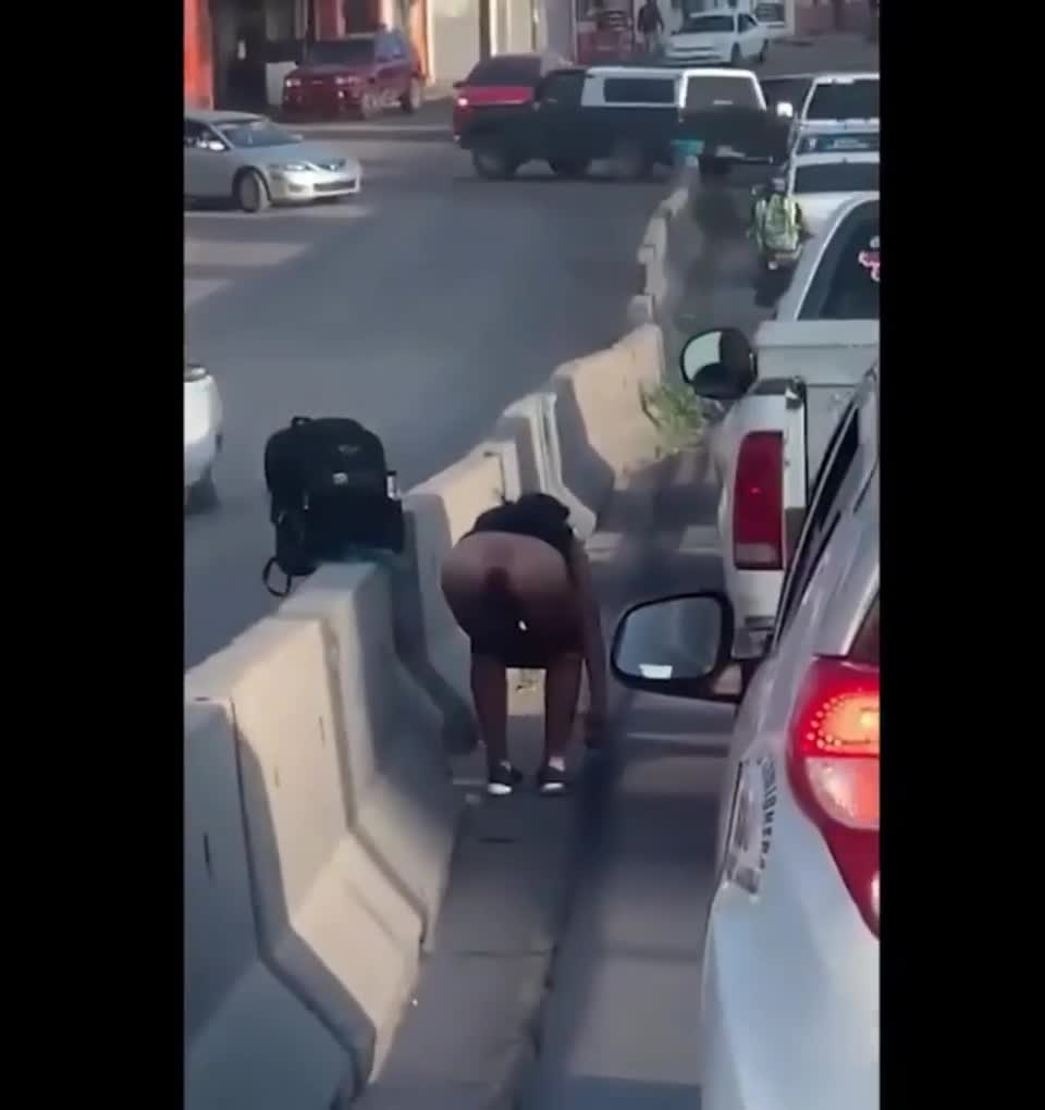 В пробке на шоссе женщина имитирует проезд на красный свет, демонстрируя свою толстую кишку, выпирающую из огромного ануса.