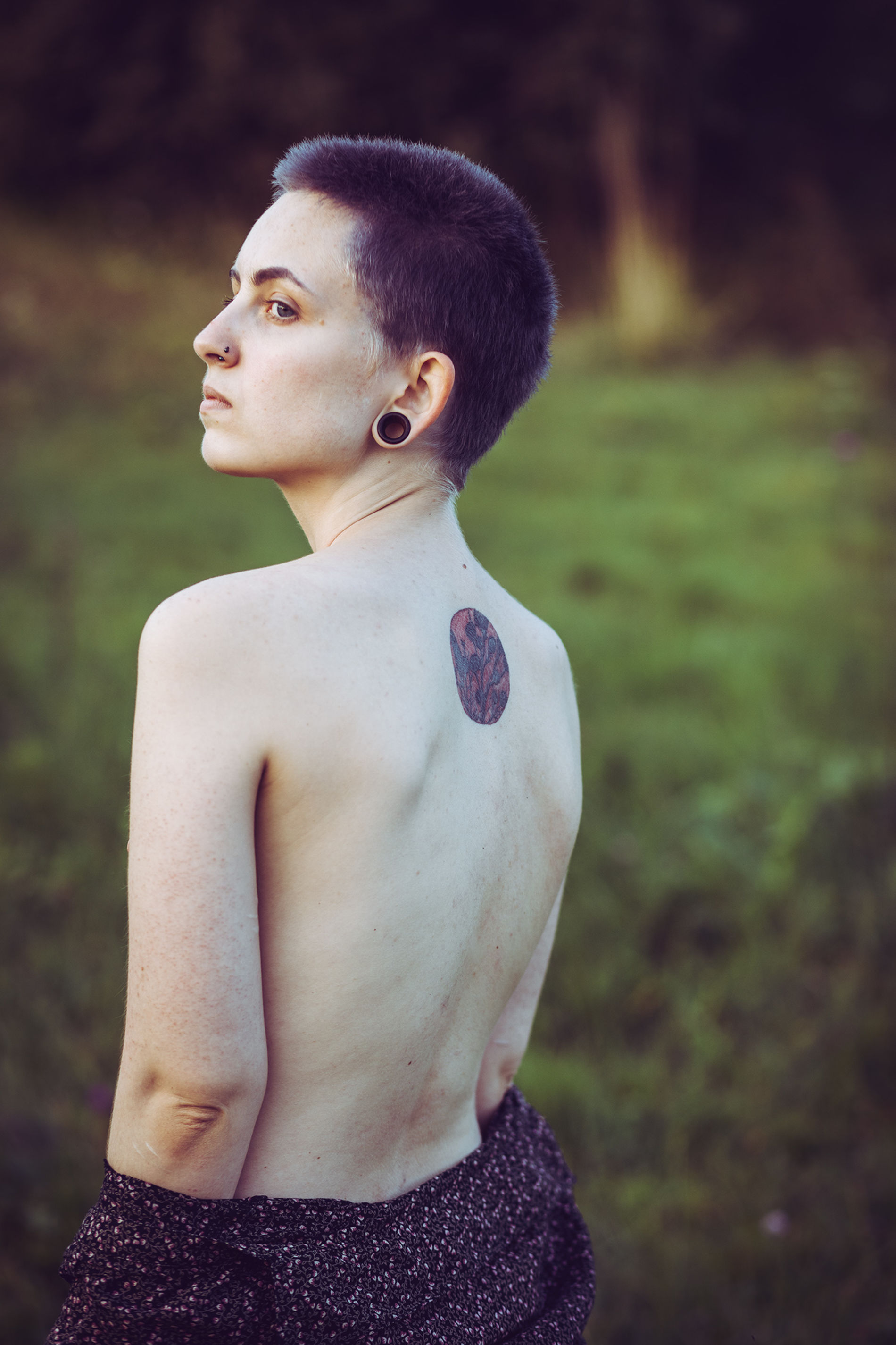 Девушка с короткой стрижкой и выразительными татуировками позирует на природе.