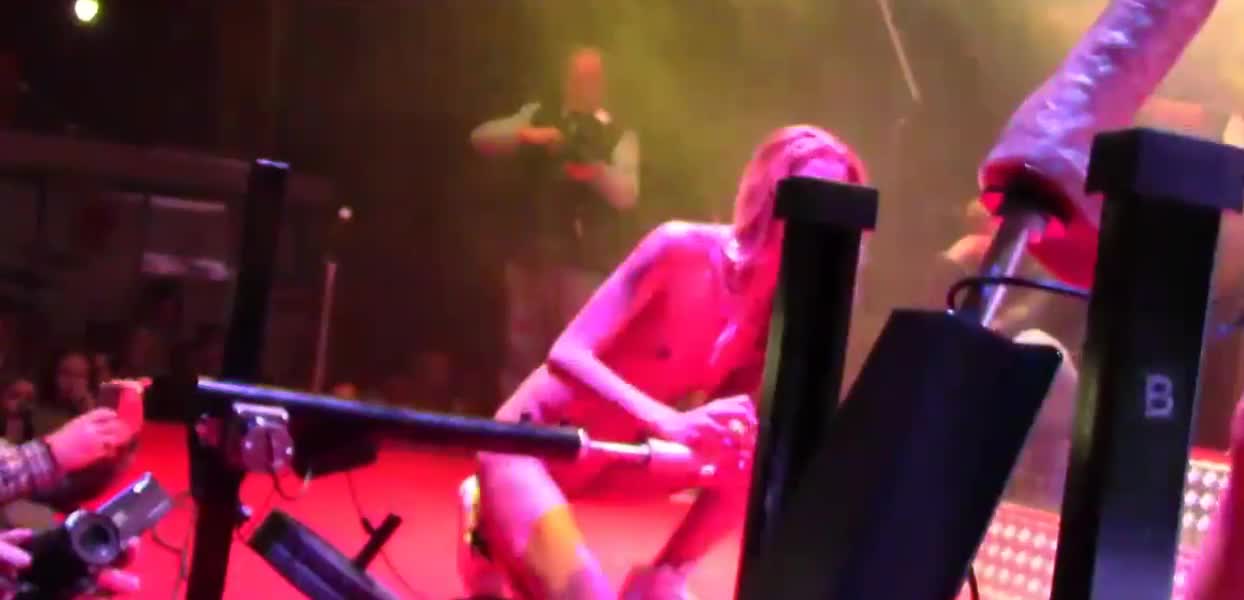 Две красивые обнаженные девушки демонстрируют, как заниматься сексом с помощью механического дилдо, перед многочисленной публикой на порновыставке.
